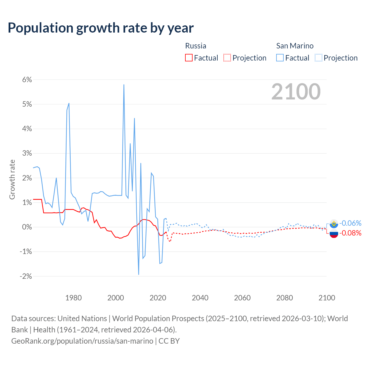- For the last 10 years, Russia has had an average growth rate of -0.02% per year vs +0.26% in San Marino.