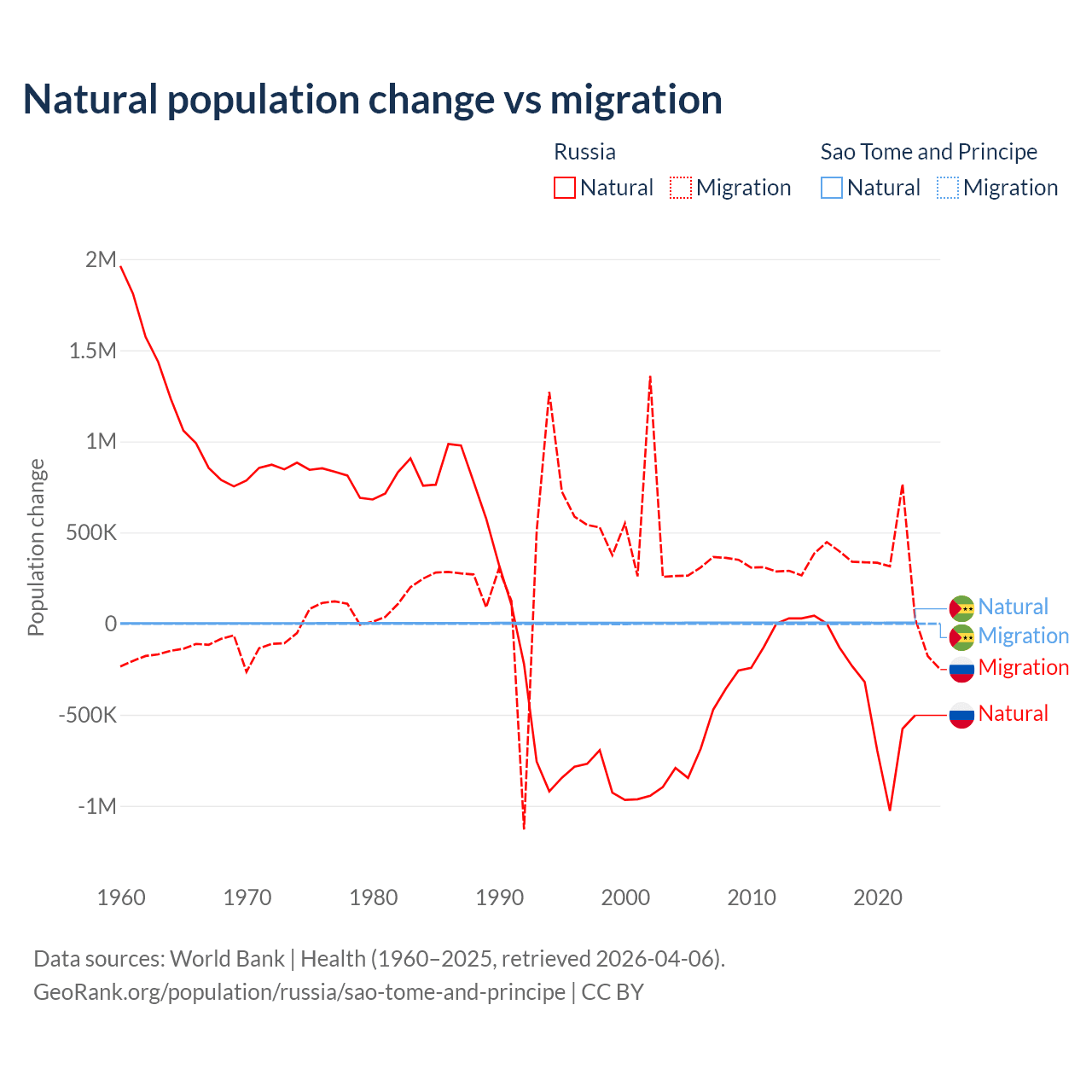 Over the last 10 years, 48.6% of the population change in Russia is from natural causes (a loss of 3,416,377 people) and 51.4% is from migration (a gain of 3,611,826 people). In Sao Tome and Principe 80.1% is from natural causes (a gain of 50,822 people) and 19.9% is from migration (a loss of 12,621 people).