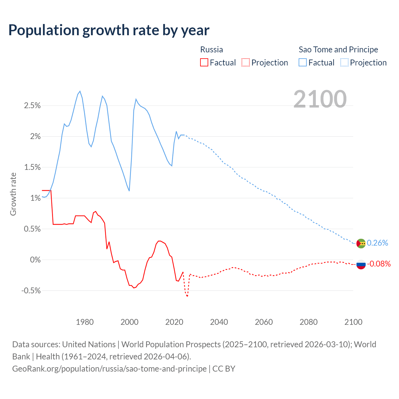 - For the last 10 years, Russia has had an average growth rate of -0.02% per year vs +1.82% in Sao Tome and Principe.