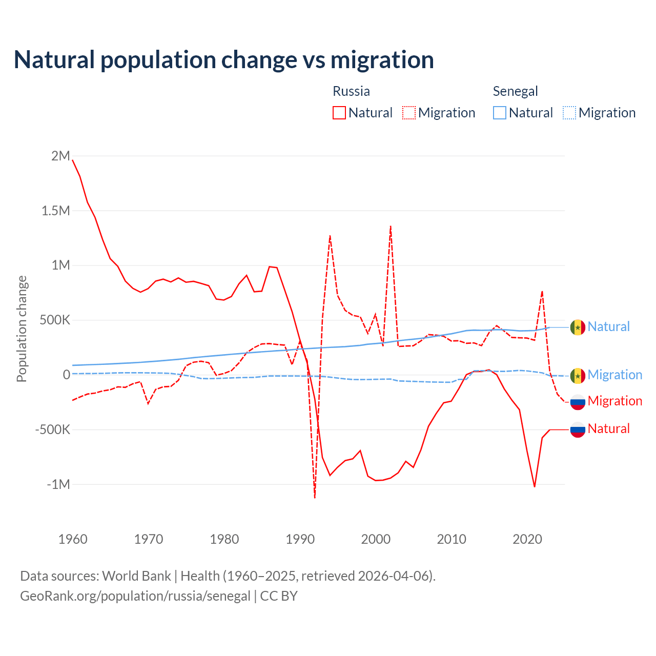 Over the last 10 years, 48.6% of the population change in Russia is from natural causes (a loss of 3,416,377 people) and 51.4% is from migration (a gain of 3,611,826 people). In Senegal 93.9% is from natural causes (a gain of 4,089,205 people) and 6.13% is from migration (a gain of 267,266 people).