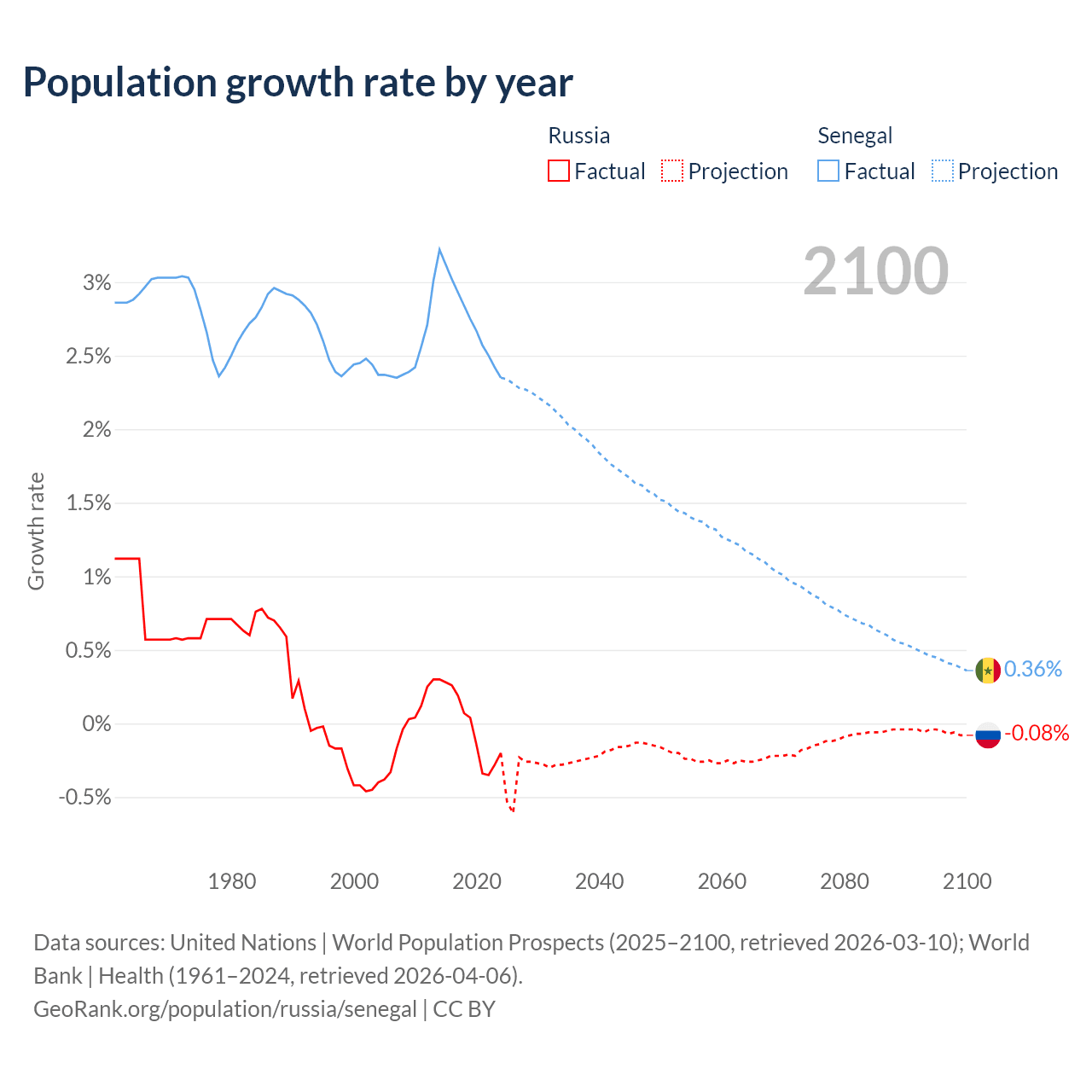 - For the last 10 years, Russia has had an average growth rate of -0.02% per year vs +2.76% in Senegal.