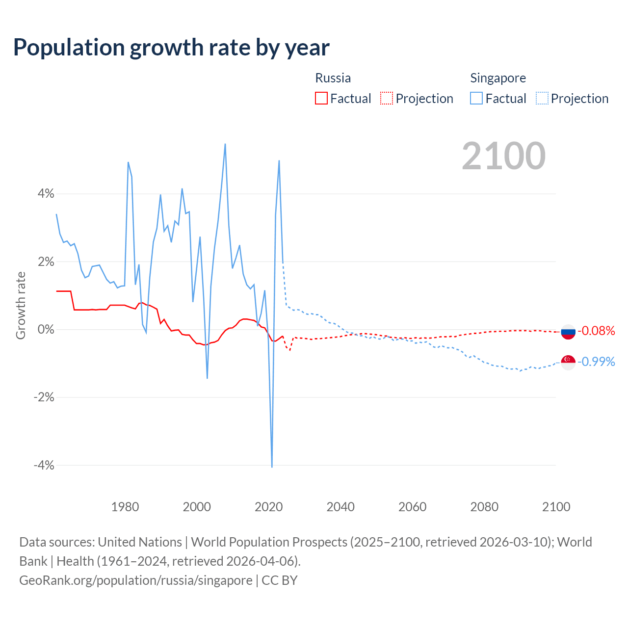 - For the last 10 years, Russia has had an average growth rate of -0.02% per year vs +1.04% in Singapore.