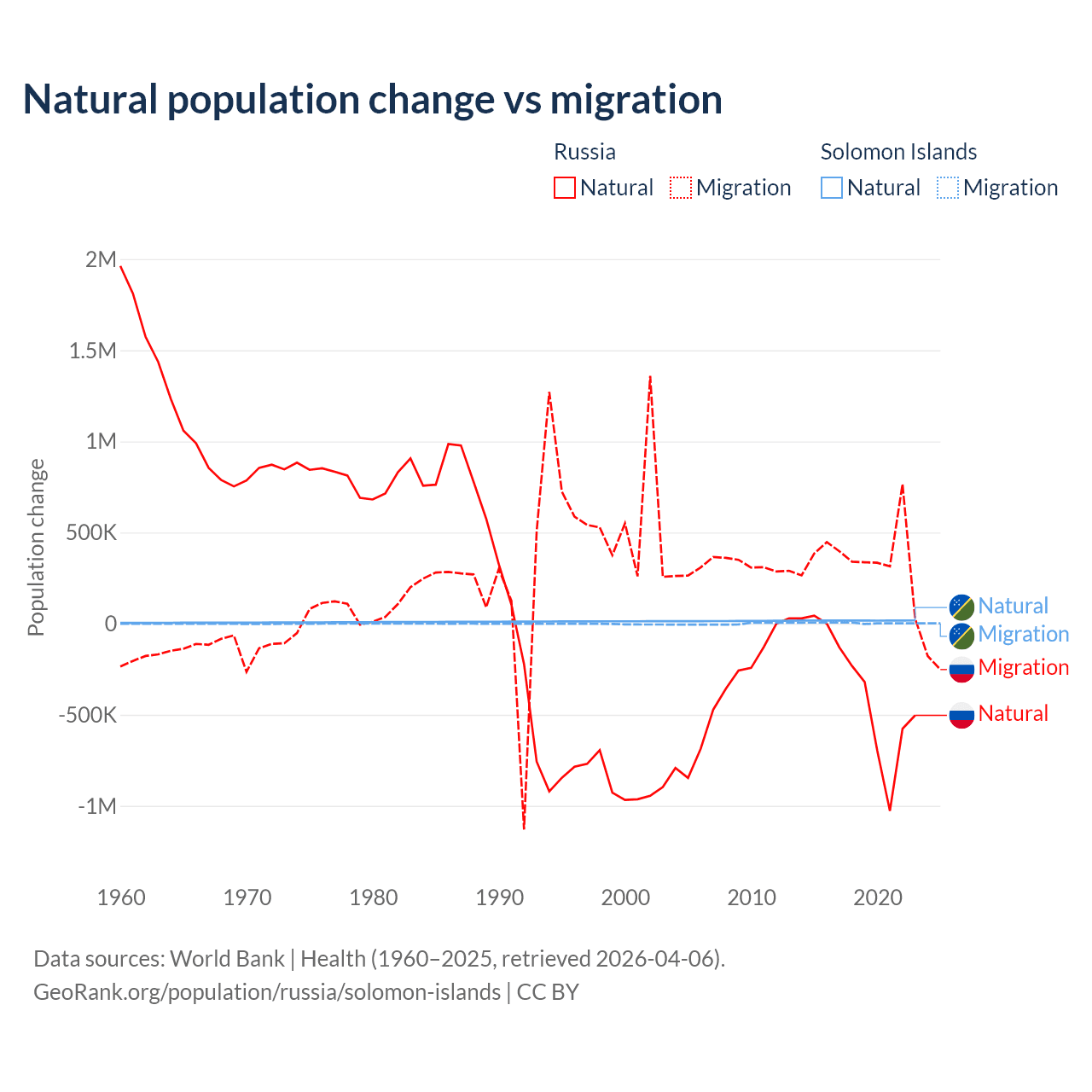 Over the last 10 years, 48.6% of the population change in Russia is from natural causes (a loss of 3,416,377 people) and 51.4% is from migration (a gain of 3,611,826 people). In the Solomon Islands 82.8% is from natural causes (a gain of 168,727 people) and 17.2% is from migration (a gain of 35,031 people).