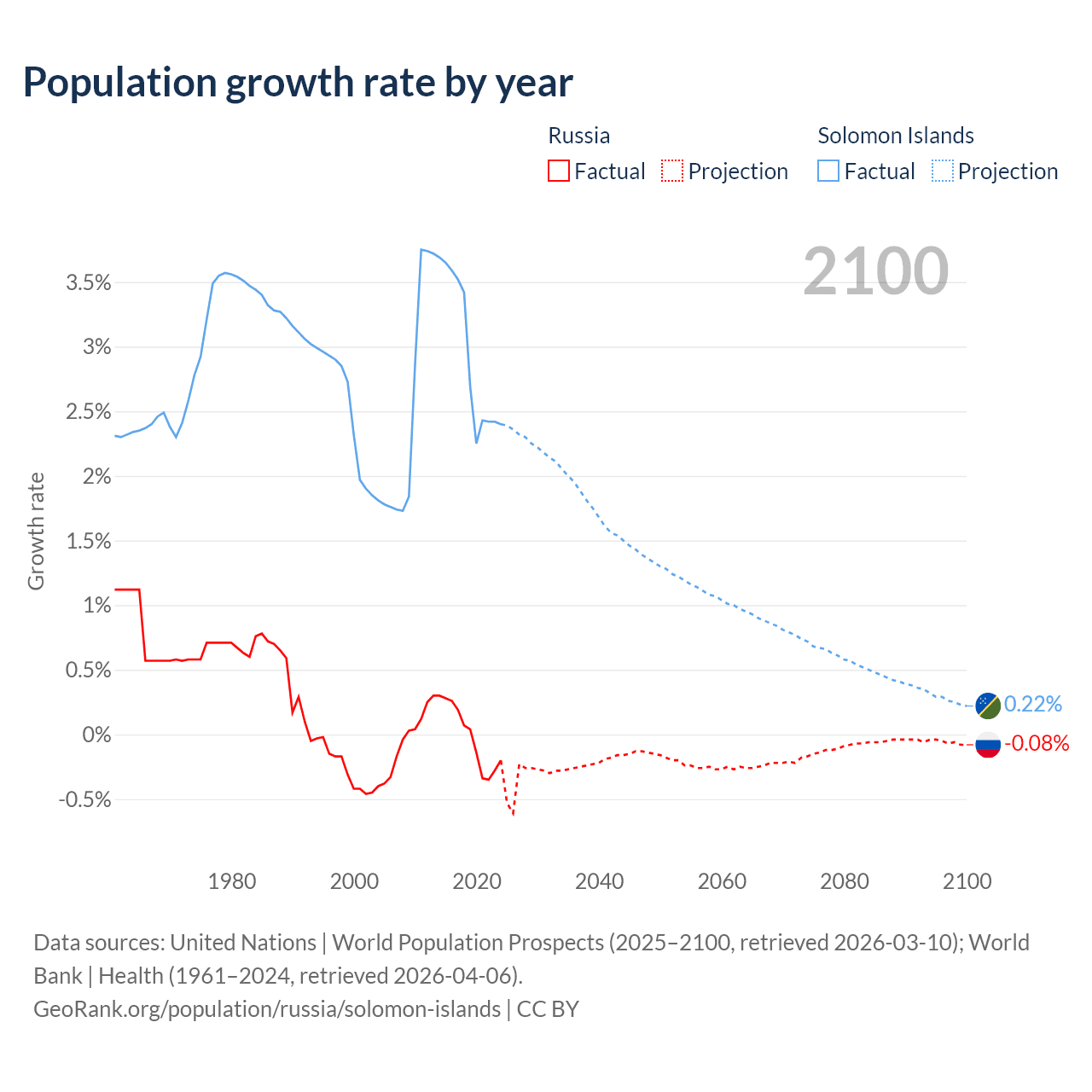 - For the last 10 years, Russia has had an average growth rate of -0.02% per year vs +2.95% in the Solomon Islands.