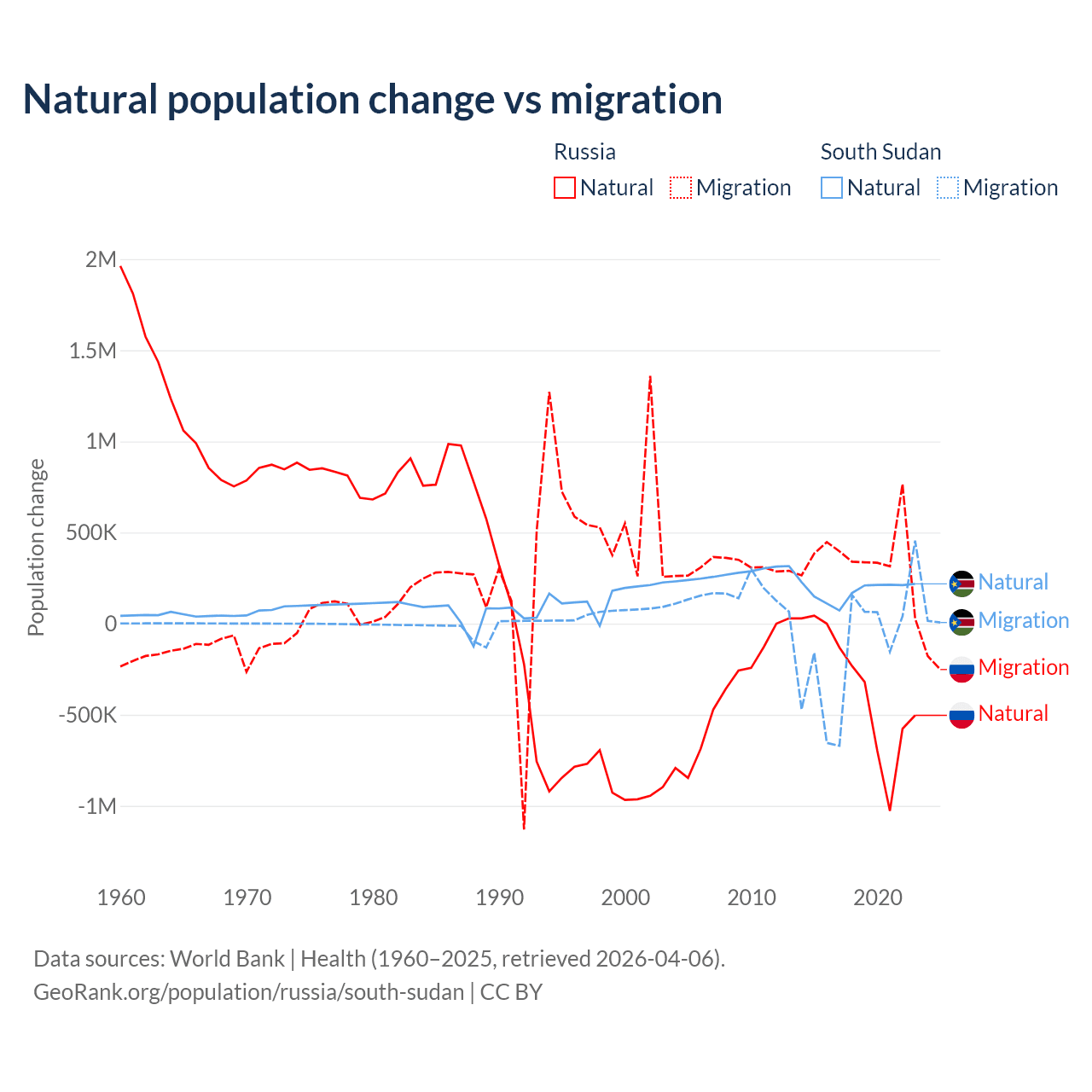 Over the last 10 years, 48.6% of the population change in Russia is from natural causes (a loss of 3,416,377 people) and 51.4% is from migration (a gain of 3,611,826 people). In South Sudan 57.4% is from natural causes (a gain of 1,792,135 people) and 42.6% is from migration (a loss of 1,329,606 people).