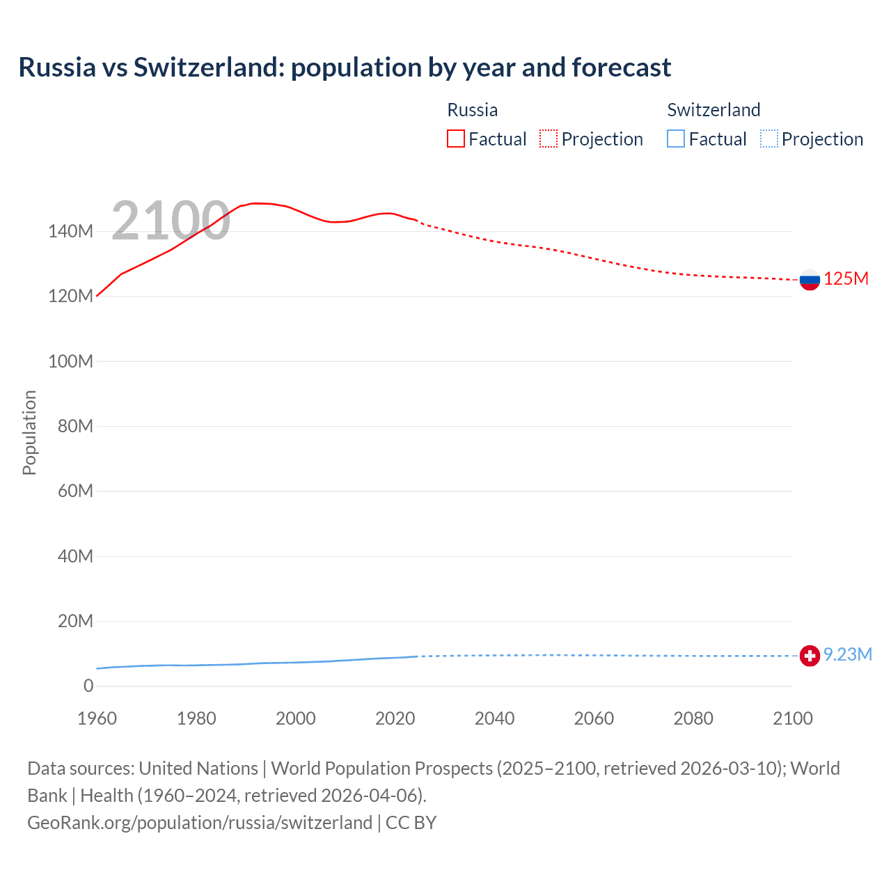 The latest officially reported population of Russia was 143,533,851 in 2024 vs 9,005,582 people in Switzerland in 2024. In 2026, based on the adjusted UN estimation, the current Russia's population is 141,906,741 people compared to 9,107,866 in Switzerland.