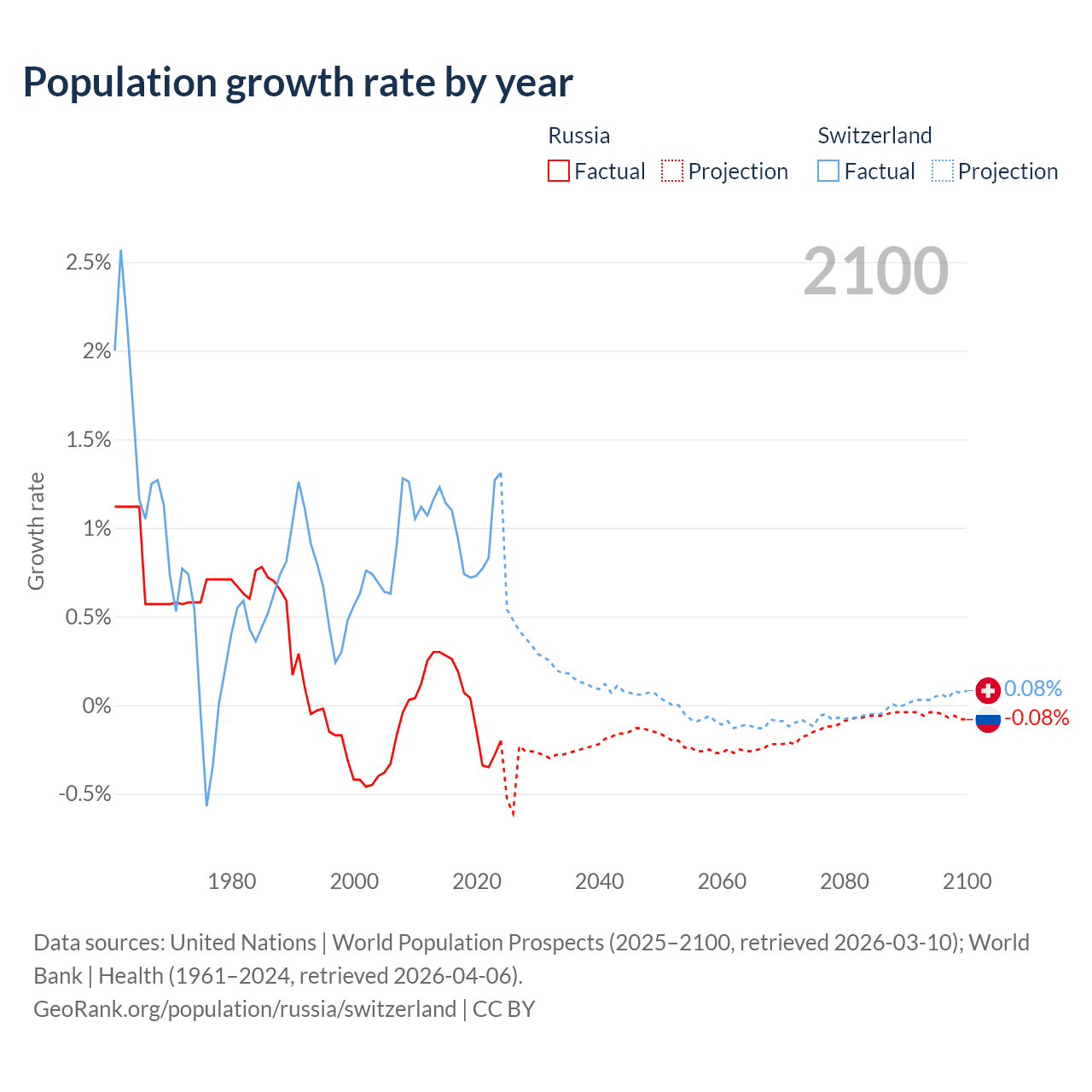 - For the last 10 years, Russia has had an average growth rate of -0.02% per year vs +0.98% in Switzerland.