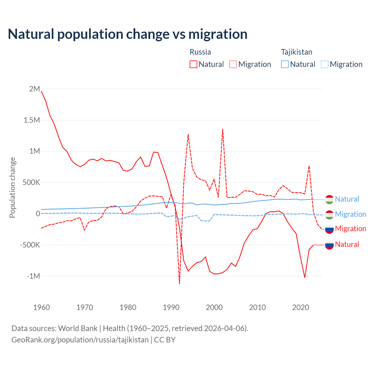 Over the last 10 years, 48.6% of the population change in Russia is from natural causes (a loss of 3,416,377 people) and 51.4% is from migration (a gain of 3,611,826 people). In Tajikistan 96% is from natural causes (a gain of 2,266,045 people) and 3.95% is from migration (a loss of 93,205 people).