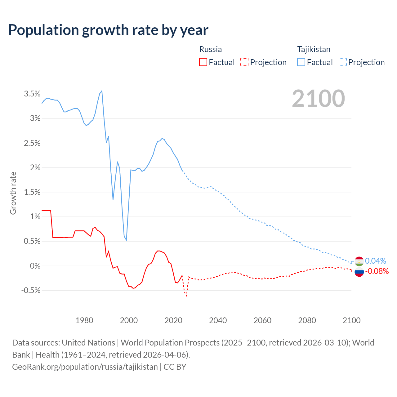 - For the last 10 years, Russia has had an average growth rate of -0.02% per year vs +2.33% in Tajikistan.