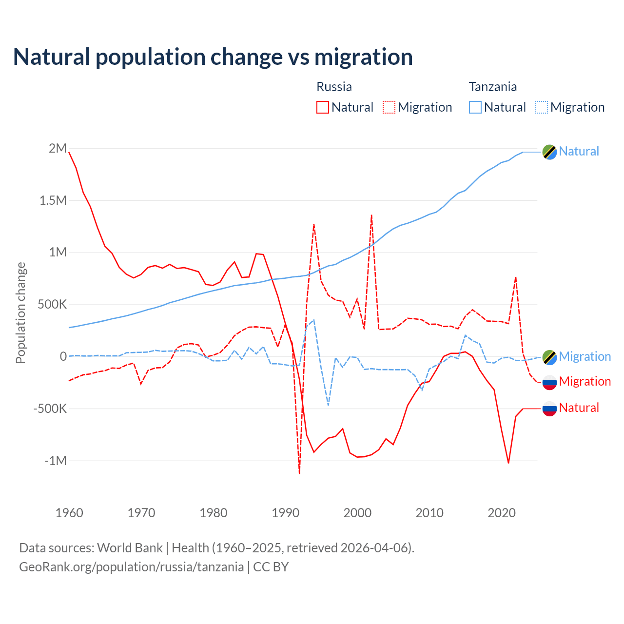 Over the last 10 years, 48.6% of the population change in Russia is from natural causes (a loss of 3,416,377 people) and 51.4% is from migration (a gain of 3,611,826 people). In Tanzania 98.7% is from natural causes (a gain of 17,769,541 people) and 1.27% is from migration (a gain of 229,466 people).