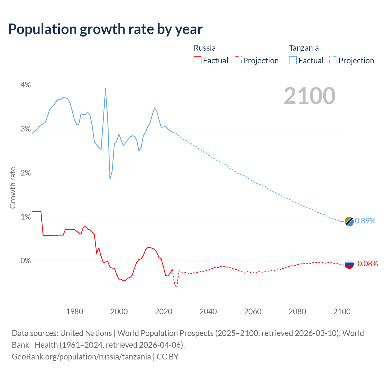 - For the last 10 years, Russia has had an average growth rate of -0.02% per year vs +3.13% in Tanzania.