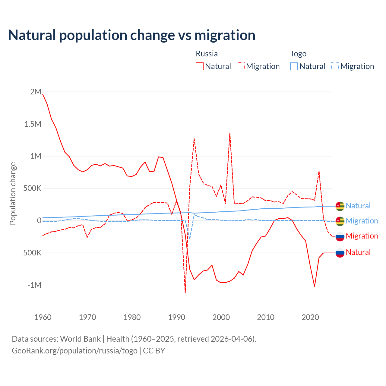 Over the last 10 years, 48.6% of the population change in Russia is from natural causes (a loss of 3,416,377 people) and 51.4% is from migration (a gain of 3,611,826 people). In Togo 99.1% is from natural causes (a gain of 2,052,115 people) and 0.86% is from migration (a loss of 17,852 people).
