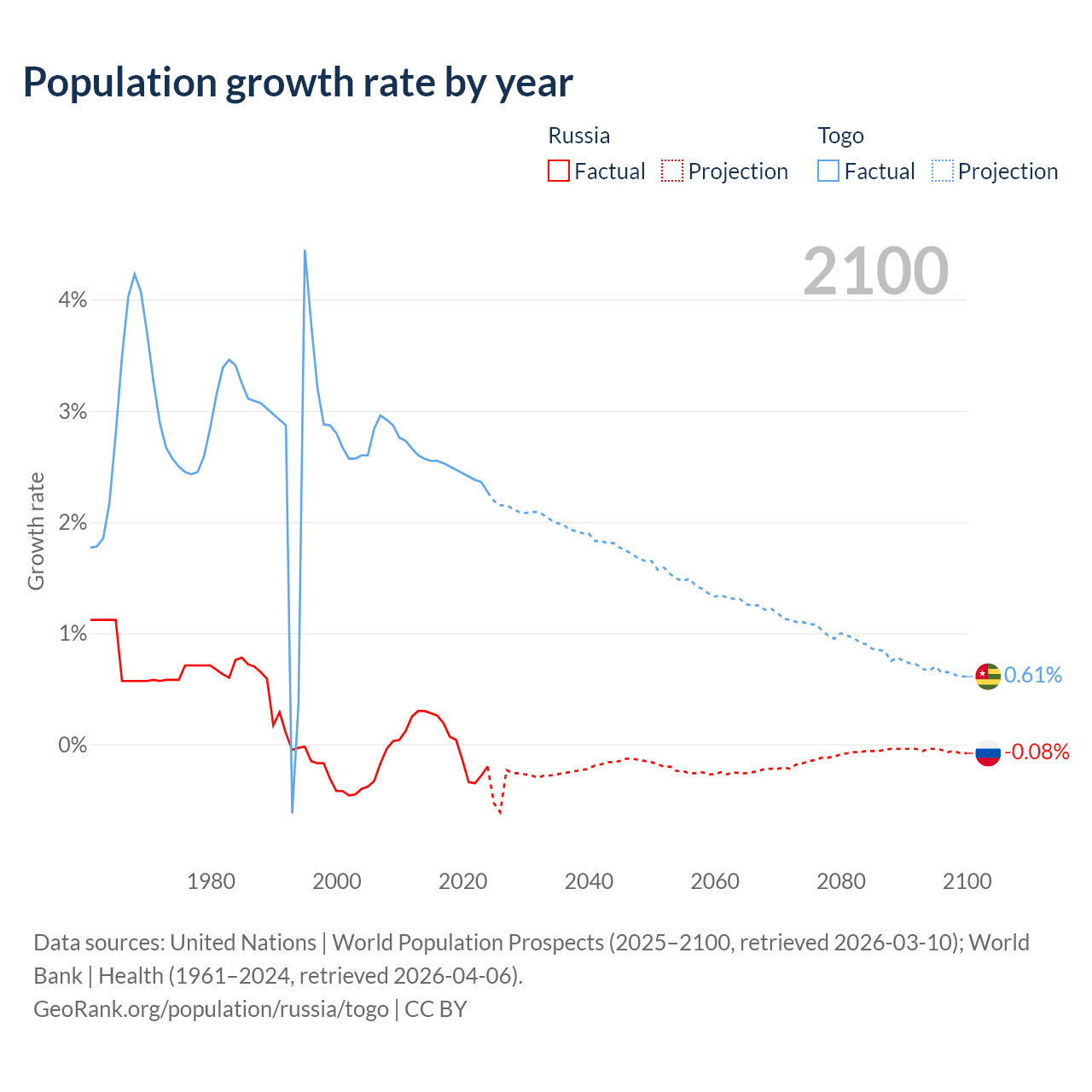 - For the last 10 years, Russia has had an average growth rate of -0.02% per year vs +2.46% in Togo.