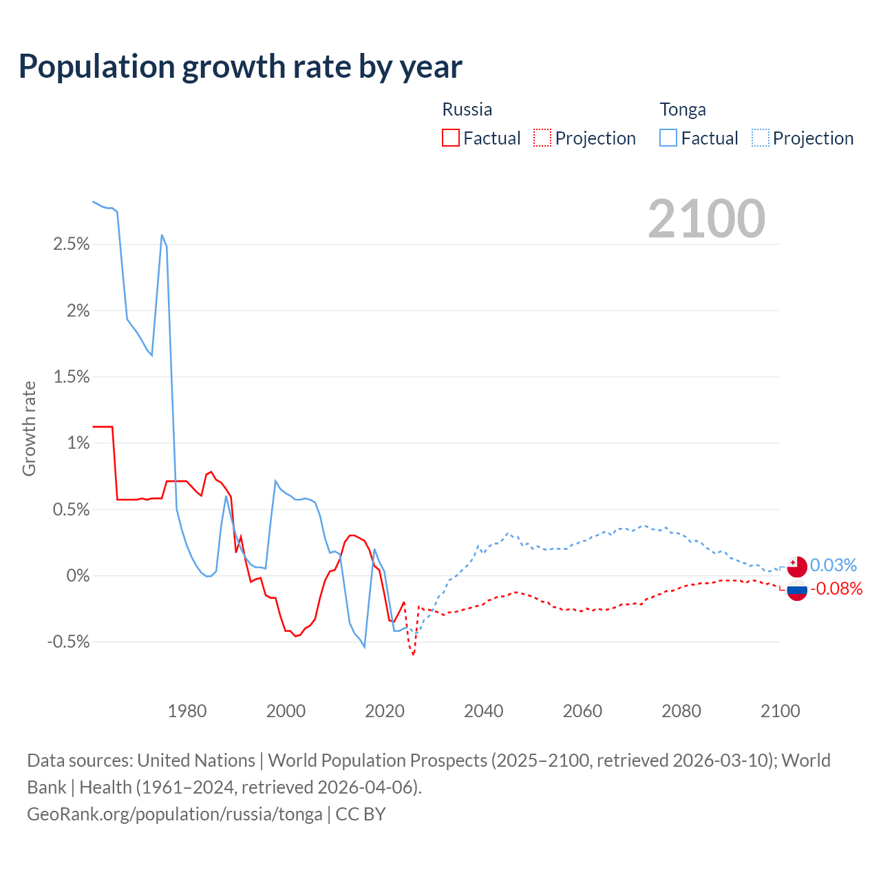 - For the last 10 years, Russia has had an average growth rate of -0.02% per year vs -0.25% in Tonga.
