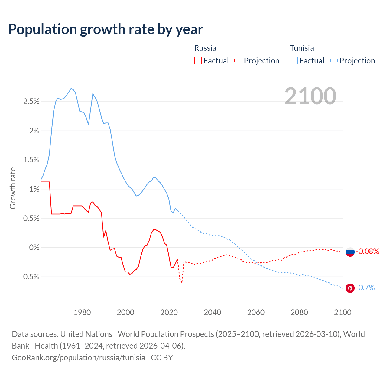- For the last 10 years, Russia has had an average growth rate of -0.02% per year vs +0.89% in Tunisia.