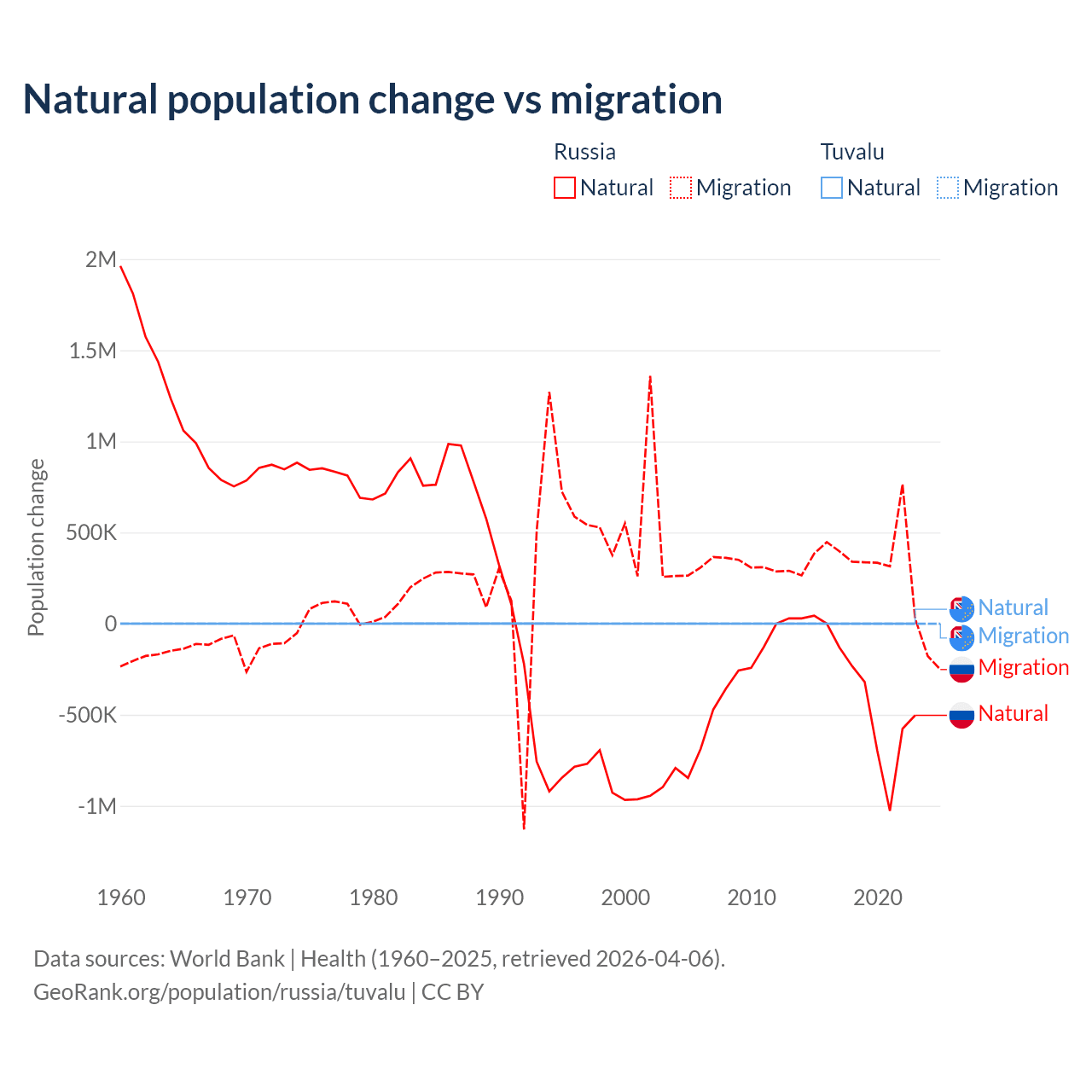 Over the last 10 years, 48.6% of the population change in Russia is from natural causes (a loss of 3,416,377 people) and 51.4% is from migration (a gain of 3,611,826 people). In Tuvalu 35.5% is from natural causes (a gain of 1,556 people) and 64.5% is from migration (a loss of 2,827 people).