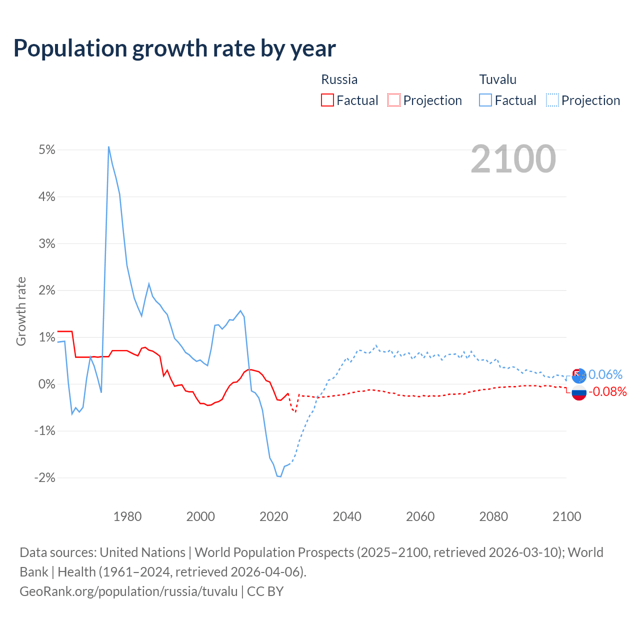 - For the last 10 years, Russia has had an average growth rate of -0.02% per year vs -1.19% in Tuvalu.