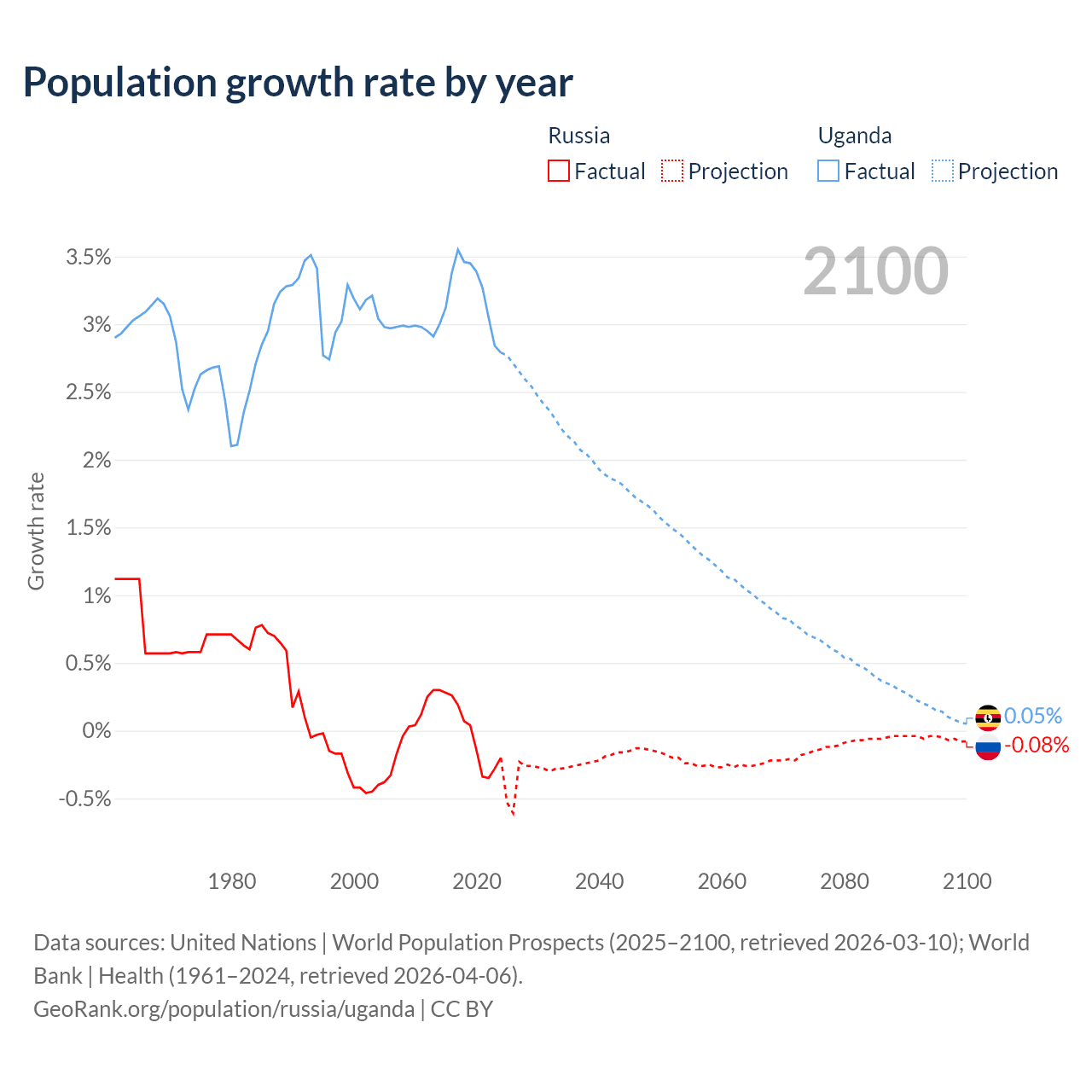- For the last 10 years, Russia has had an average growth rate of -0.02% per year vs +3.21% in Uganda.