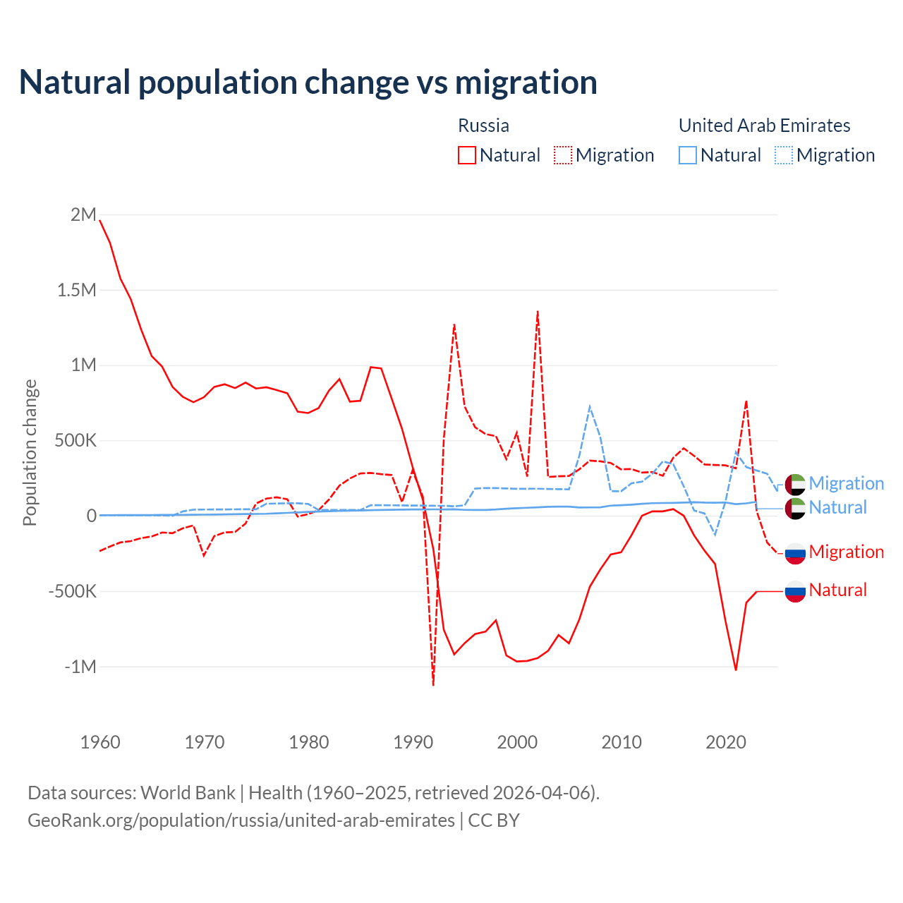 Over the last 10 years, 48.6% of the population change in Russia is from natural causes (a loss of 3,416,377 people) and 51.4% is from migration (a gain of 3,611,826 people). In the United Arab Emirates 30.5% is from natural causes (a gain of 857,996 people) and 69.5% is from migration (a gain of 1,958,520 people).