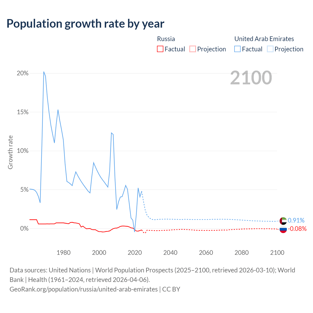 - For the last 10 years, Russia has had an average growth rate of -0.02% per year vs +3.31% in the United Arab Emirates.