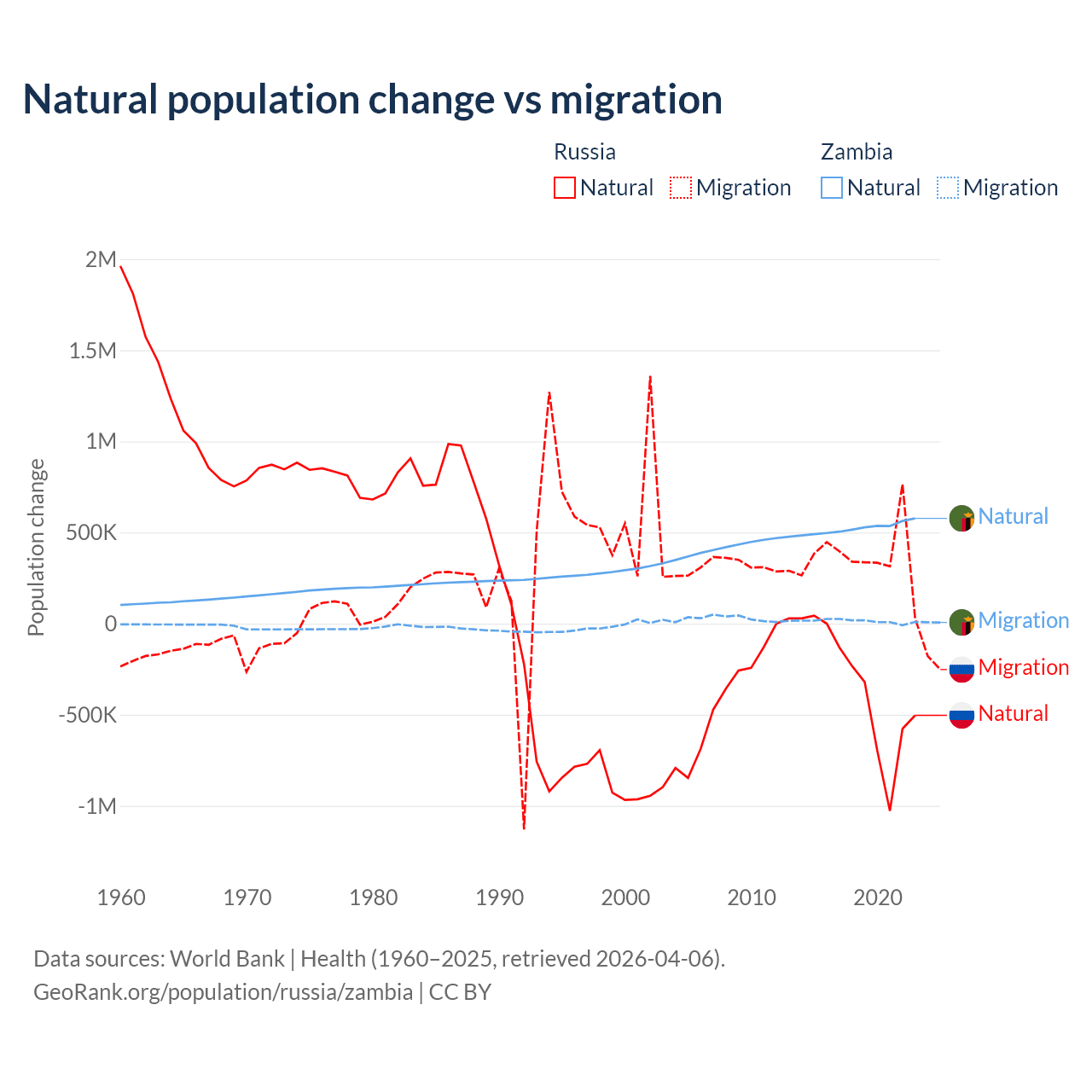 Over the last 10 years, 48.6% of the population change in Russia is from natural causes (a loss of 3,416,377 people) and 51.4% is from migration (a gain of 3,611,826 people). In Zambia 97.4% is from natural causes (a gain of 5,233,797 people) and 2.58% is from migration (a gain of 138,554 people).
