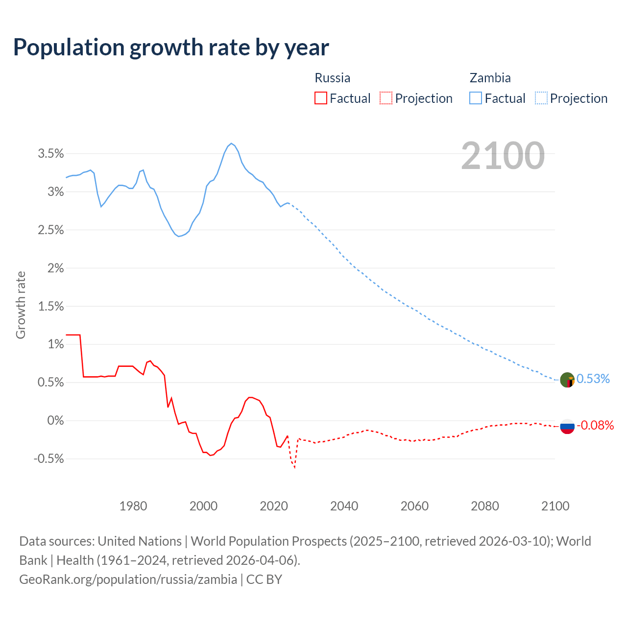 - For the last 10 years, Russia has had an average growth rate of -0.02% per year vs +3% in Zambia.