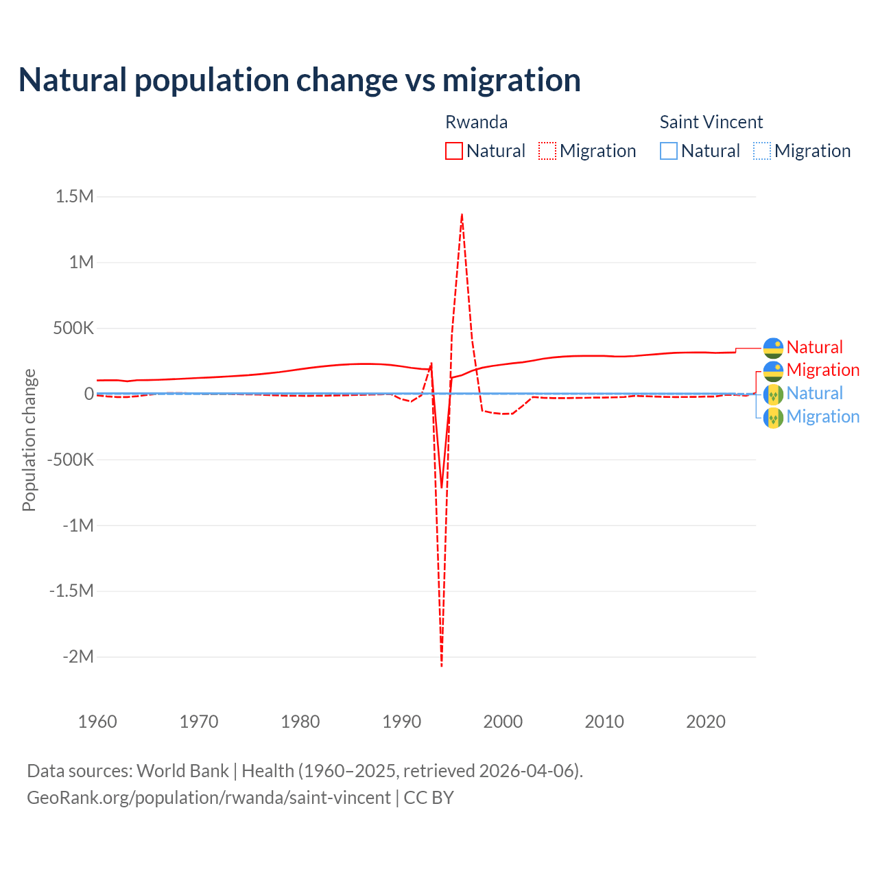Over the last 10 years, 93.8% of the population change in Rwanda is from natural causes (a gain of 3,081,296 people) and 6.18% is from migration (a loss of 203,035 people). In Saint Vincent 21.2% is from natural causes (a gain of 2,525 people) and 78.8% is from migration (a loss of 9,393 people).