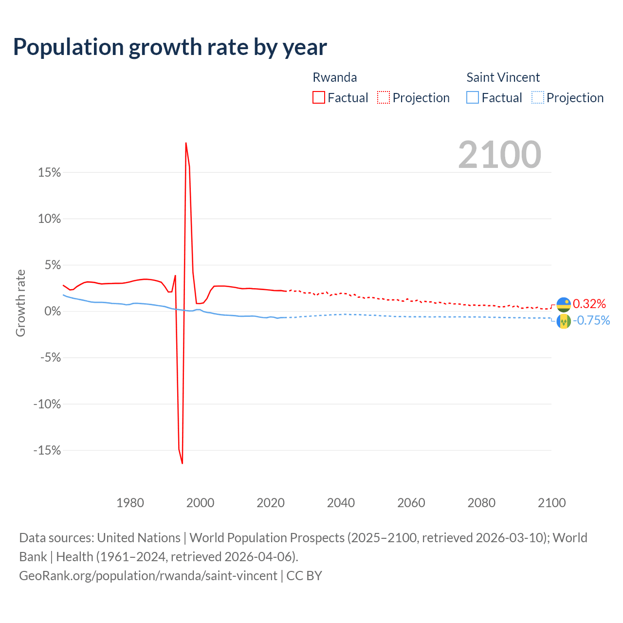 - For the last 10 years, Rwanda has had an average growth rate of +2.31% per year vs -0.65% in Saint Vincent.