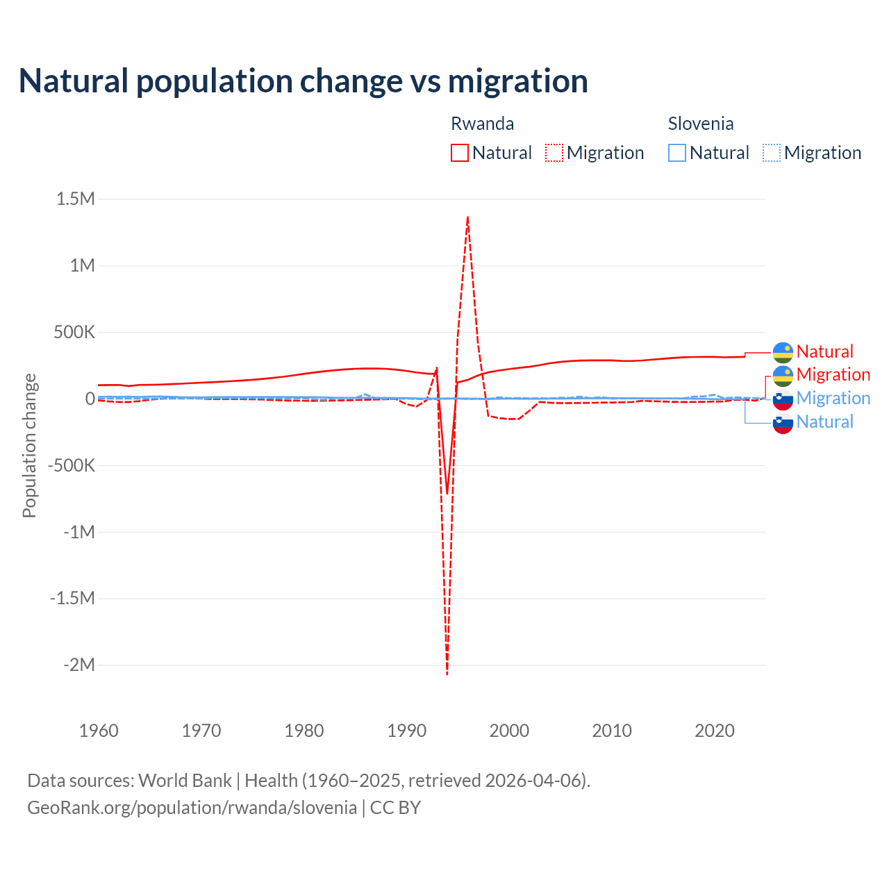 Over the last 10 years, 93.8% of the population change in Rwanda is from natural causes (a gain of 3,081,296 people) and 6.18% is from migration (a loss of 203,035 people). In Slovenia 18.1% is from natural causes (a loss of 17,573 people) and 81.9% is from migration (a gain of 79,532 people).