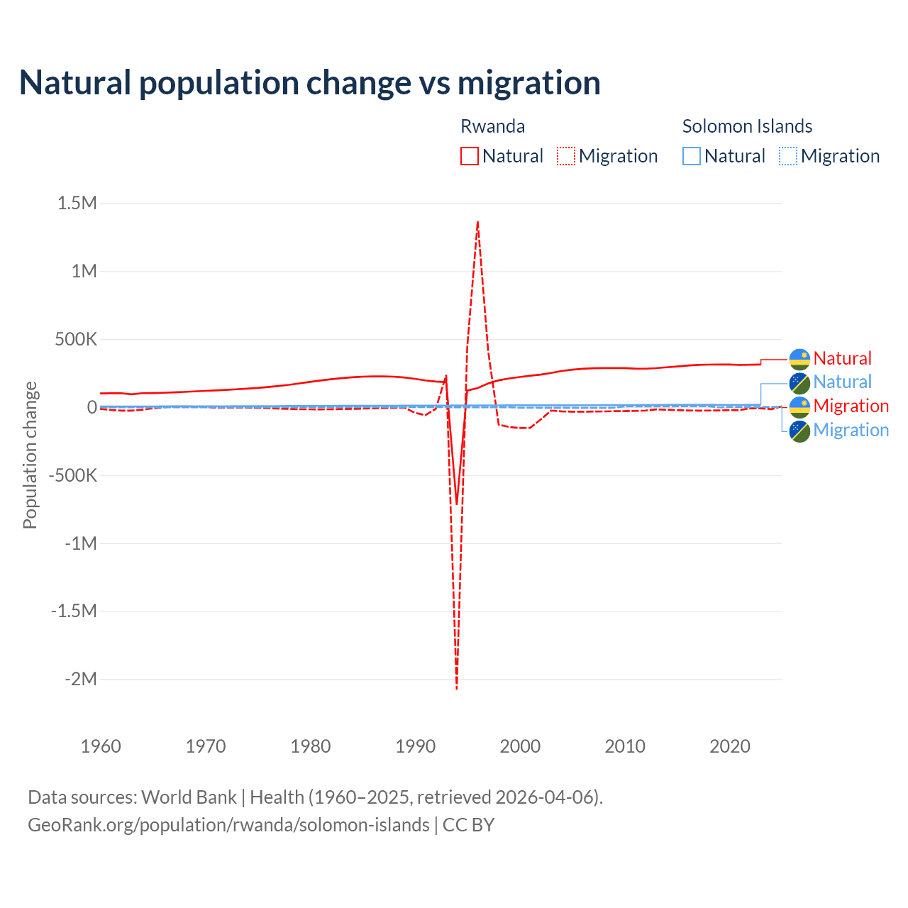 Over the last 10 years, 93.8% of the population change in Rwanda is from natural causes (a gain of 3,081,296 people) and 6.18% is from migration (a loss of 203,035 people). In the Solomon Islands 82.8% is from natural causes (a gain of 168,727 people) and 17.2% is from migration (a gain of 35,031 people).
