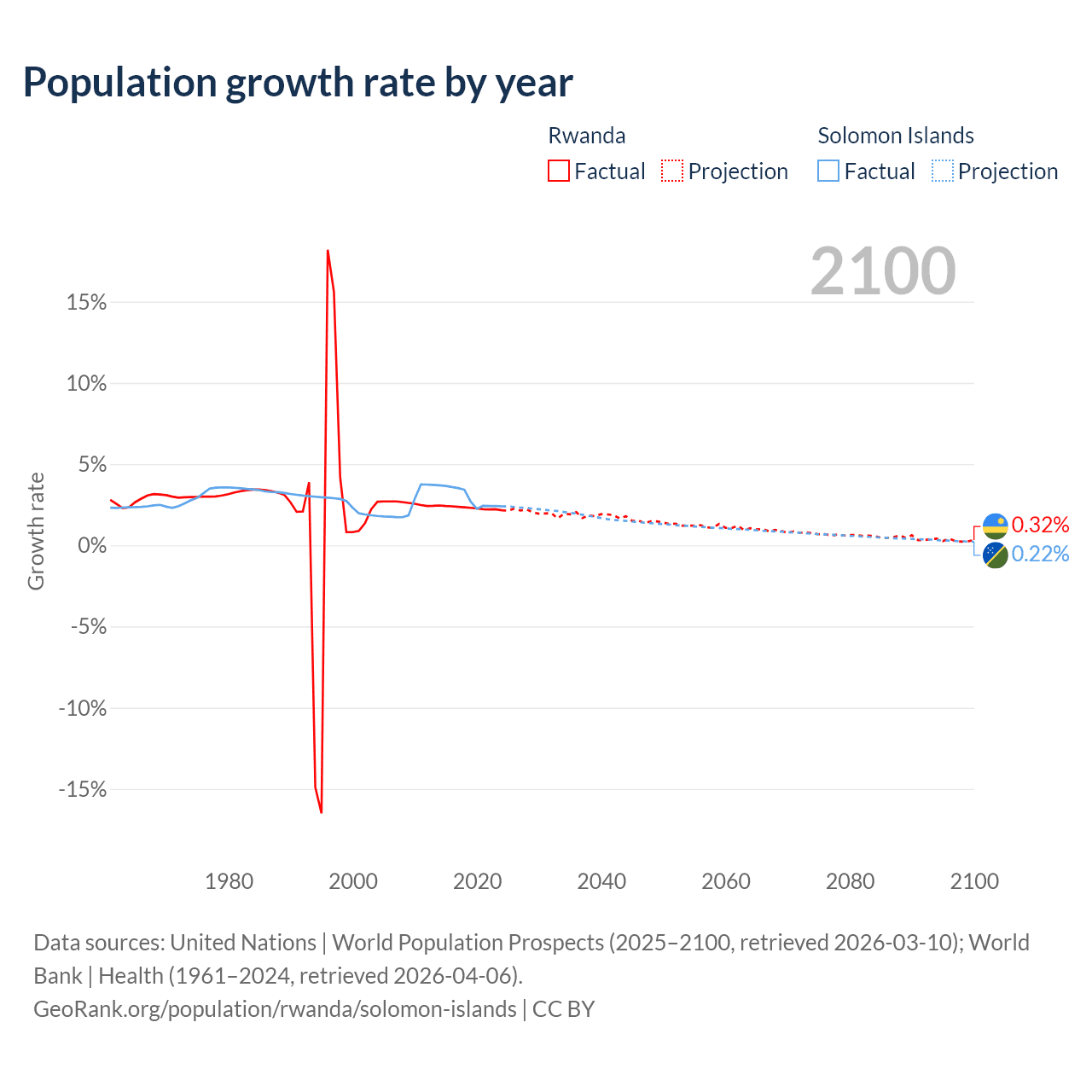 - For the last 10 years, Rwanda has had an average growth rate of +2.31% per year vs +2.95% in the Solomon Islands.
