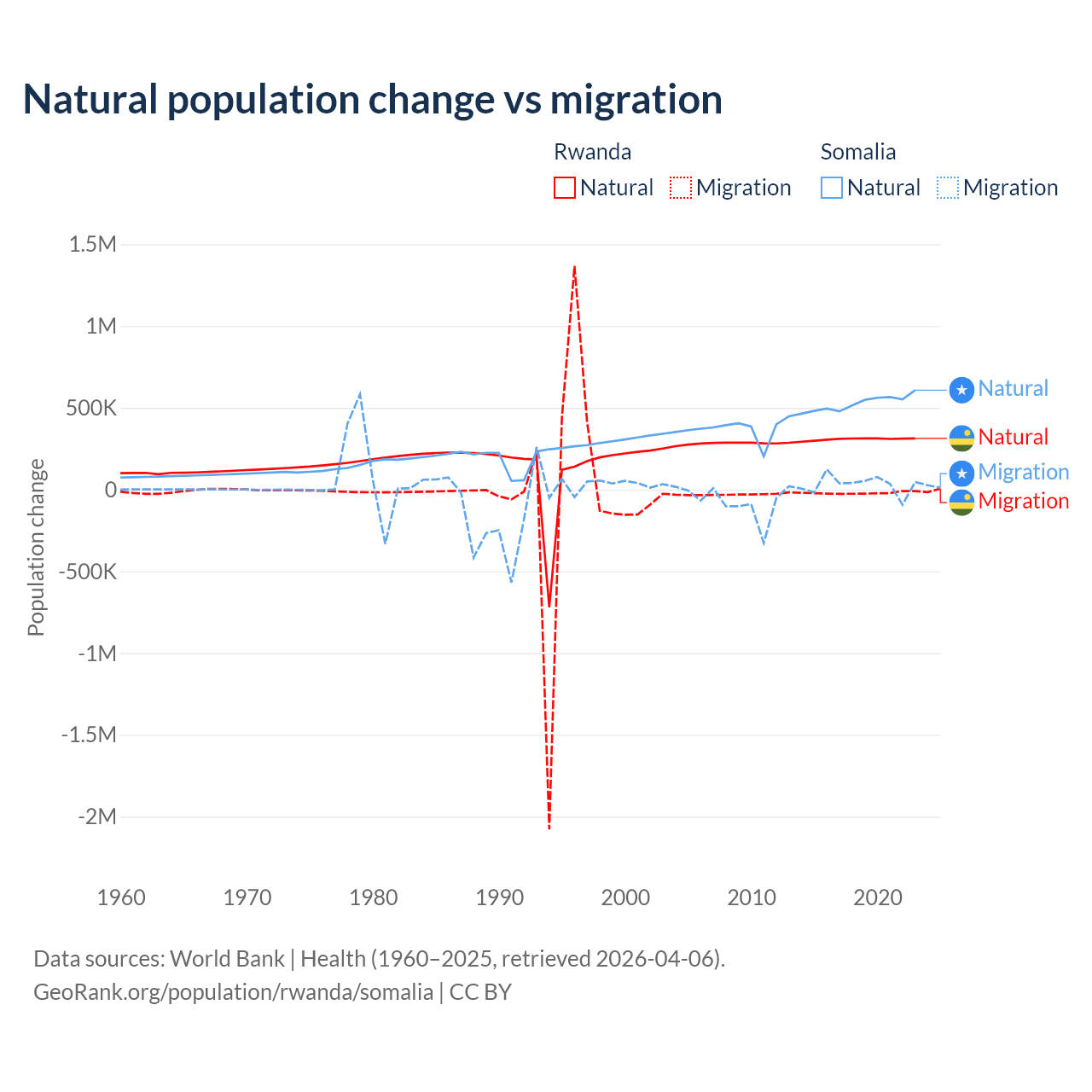 Over the last 10 years, 93.8% of the population change in Rwanda is from natural causes (a gain of 3,081,296 people) and 6.18% is from migration (a loss of 203,035 people). In Somalia 94.4% is from natural causes (a gain of 5,270,105 people) and 5.58% is from migration (a gain of 311,487 people).