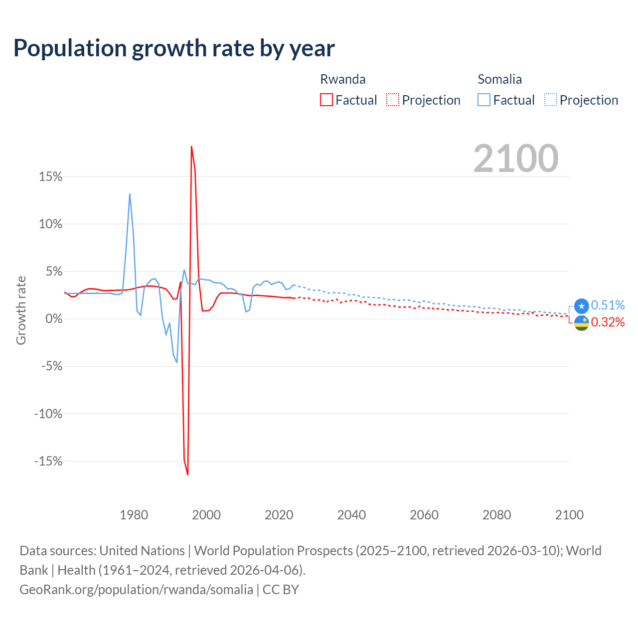 - For the last 10 years, Rwanda has had an average growth rate of +2.31% per year vs +3.61% in Somalia.