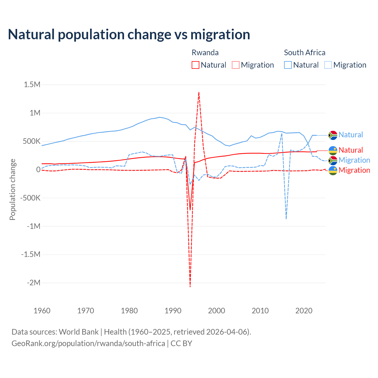 Over the last 10 years, 93.8% of the population change in Rwanda is from natural causes (a gain of 3,081,296 people) and 6.18% is from migration (a loss of 203,035 people). In South Africa 72.8% is from natural causes (a gain of 6,190,027 people) and 27.2% is from migration (a gain of 2,316,795 people).