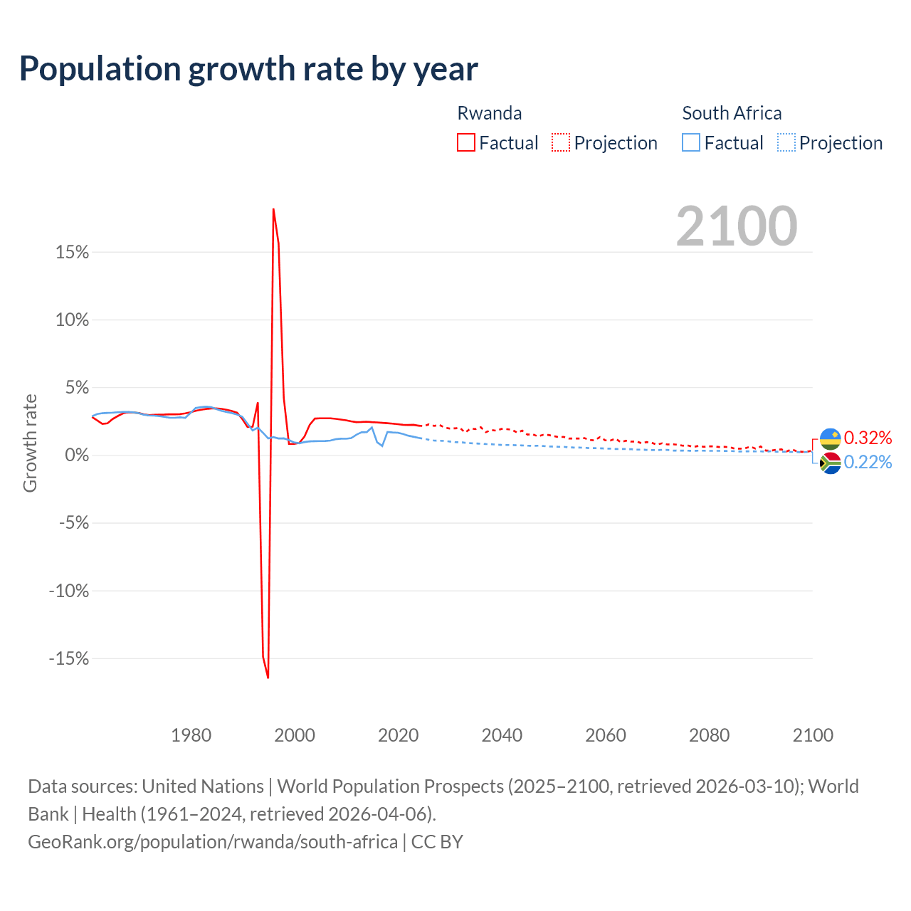 - For the last 10 years, Rwanda has had an average growth rate of +2.31% per year vs +1.44% in South Africa.