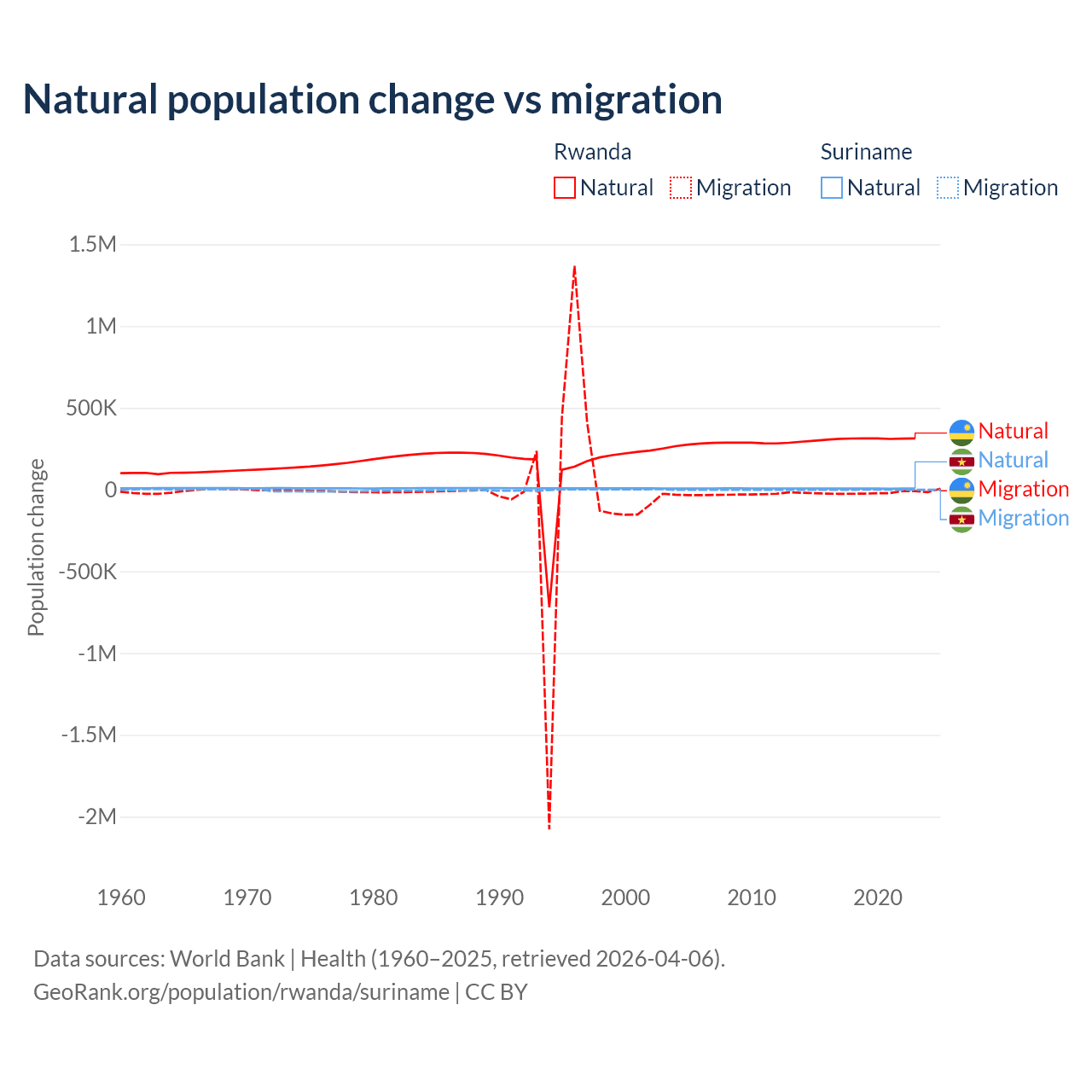 Over the last 10 years, 93.8% of the population change in Rwanda is from natural causes (a gain of 3,081,296 people) and 6.18% is from migration (a loss of 203,035 people). In Suriname 90.3% is from natural causes (a gain of 66,709 people) and 9.72% is from migration (a loss of 7,185 people).