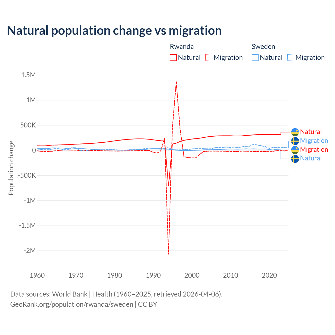 Over the last 10 years, 93.8% of the population change in Rwanda is from natural causes (a gain of 3,081,296 people) and 6.18% is from migration (a loss of 203,035 people). In Sweden 21.4% is from natural causes (a gain of 201,900 people) and 78.6% is from migration (a gain of 743,642 people).