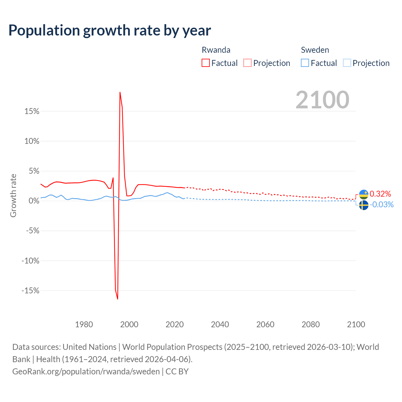 - For the last 10 years, Rwanda has had an average growth rate of +2.31% per year vs +0.88% in Sweden.