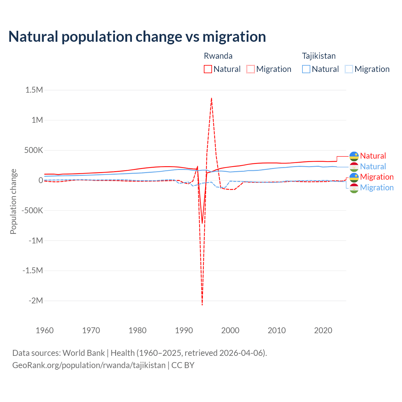 Over the last 10 years, 93.8% of the population change in Rwanda is from natural causes (a gain of 3,081,296 people) and 6.18% is from migration (a loss of 203,035 people). In Tajikistan 96% is from natural causes (a gain of 2,266,045 people) and 3.95% is from migration (a loss of 93,205 people).