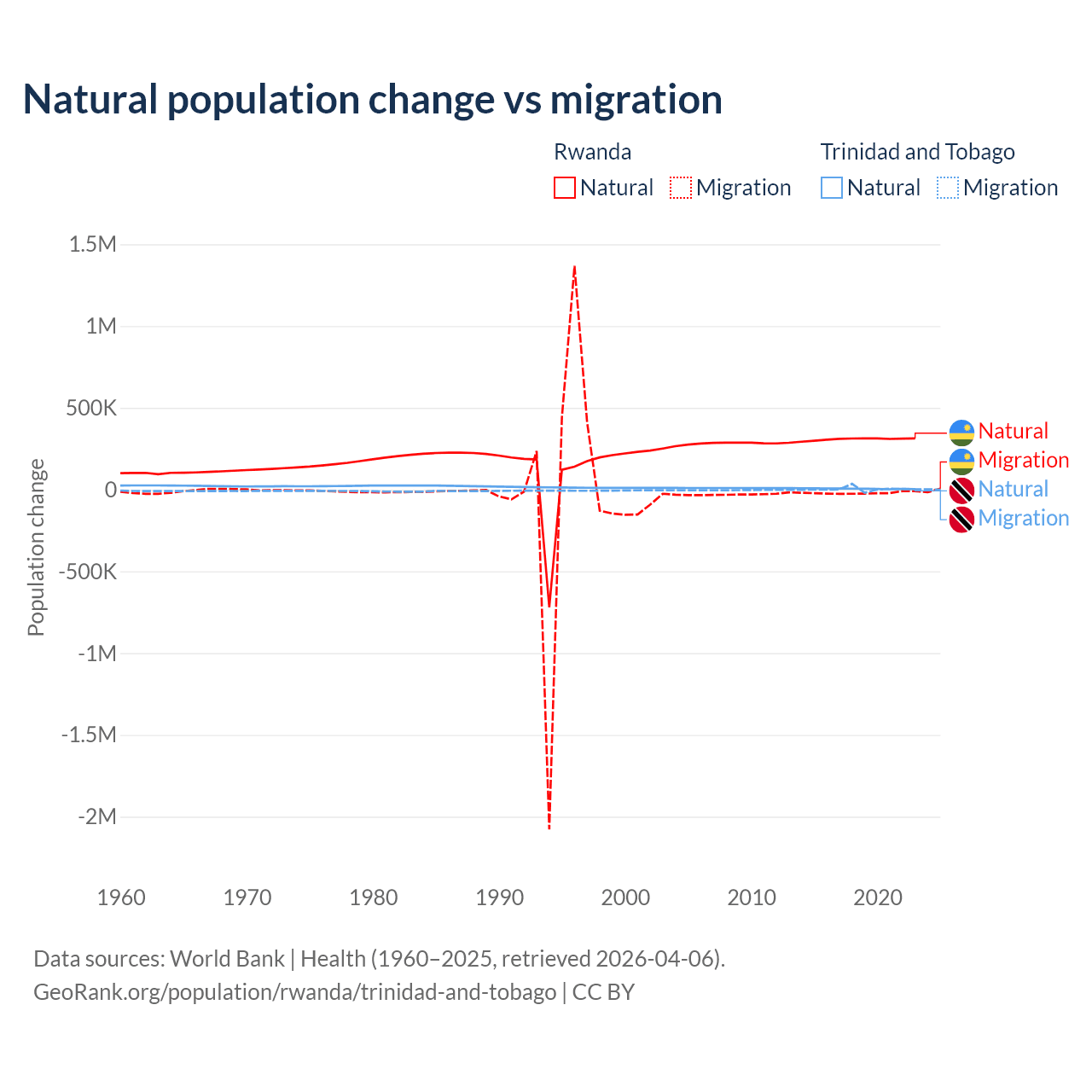 Over the last 10 years, 93.8% of the population change in Rwanda is from natural causes (a gain of 3,081,296 people) and 6.18% is from migration (a loss of 203,035 people). In Trinidad and Tobago 66% is from natural causes (a gain of 55,887 people) and 34% is from migration (a gain of 28,785 people).
