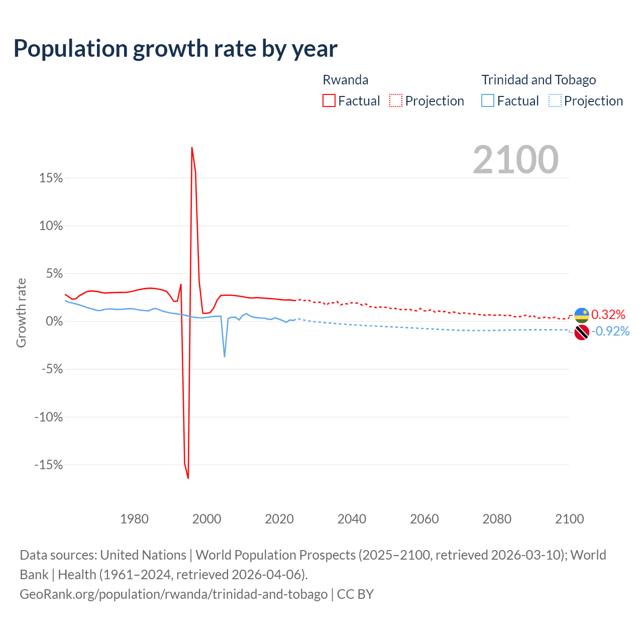 - For the last 10 years, Rwanda has had an average growth rate of +2.31% per year vs +0.19% in Trinidad and Tobago.