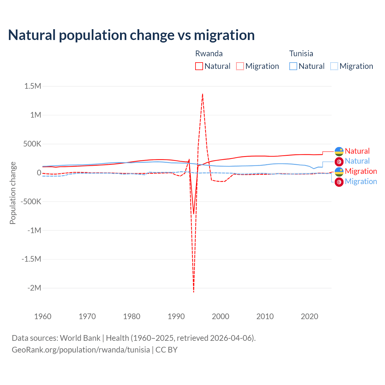 Over the last 10 years, 93.8% of the population change in Rwanda is from natural causes (a gain of 3,081,296 people) and 6.18% is from migration (a loss of 203,035 people). In Tunisia 86.3% is from natural causes (a gain of 1,225,079 people) and 13.7% is from migration (a loss of 195,011 people).
