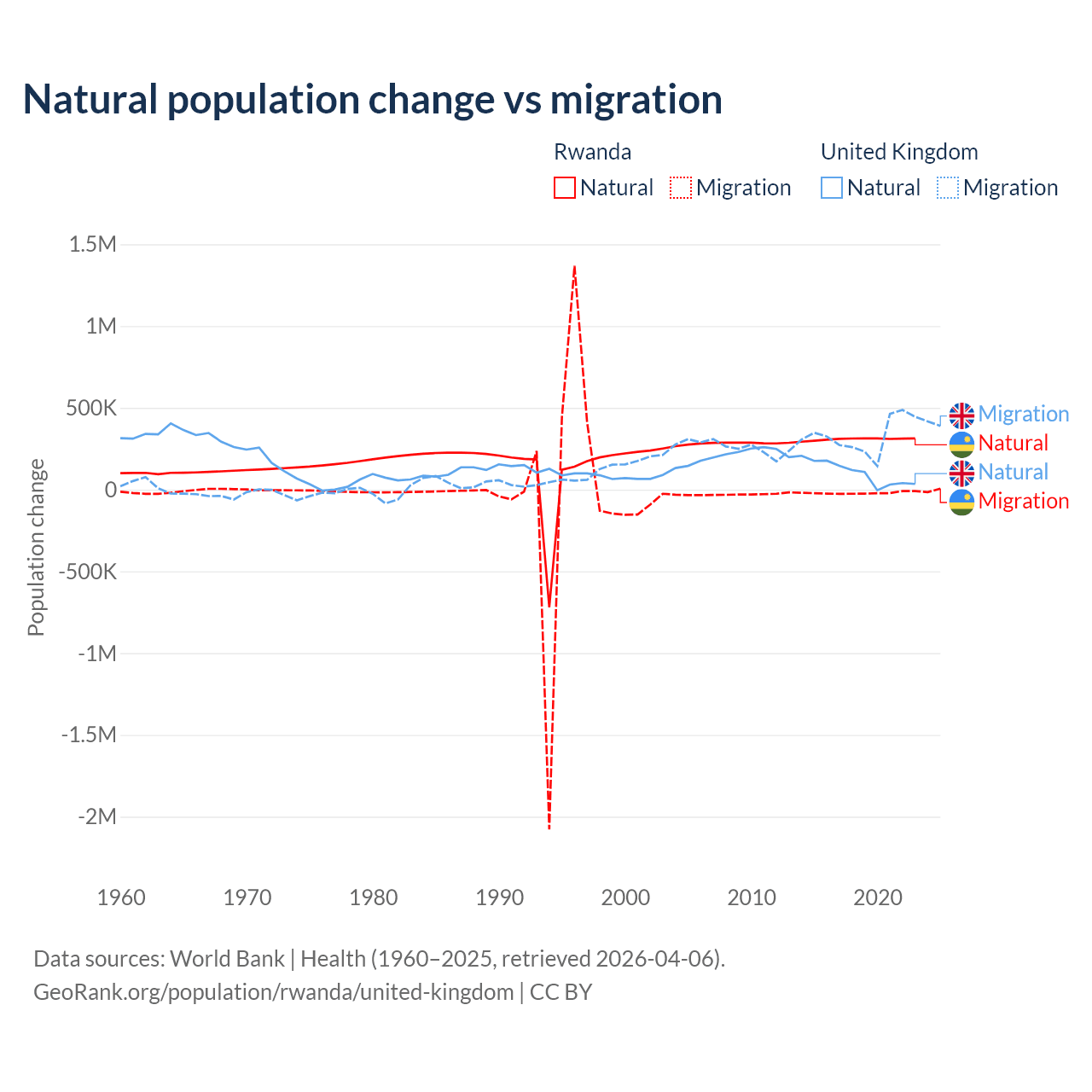 Over the last 10 years, 93.8% of the population change in Rwanda is from natural causes (a gain of 3,081,296 people) and 6.18% is from migration (a loss of 203,035 people). In the United Kingdom 23.9% is from natural causes (a gain of 1,033,129 people) and 76.1% is from migration (a gain of 3,283,101 people).
