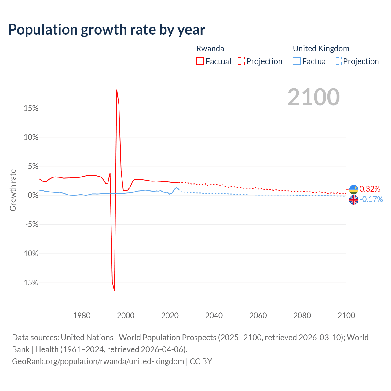 - For the last 10 years, Rwanda has had an average growth rate of +2.31% per year vs +0.7% in the United Kingdom.