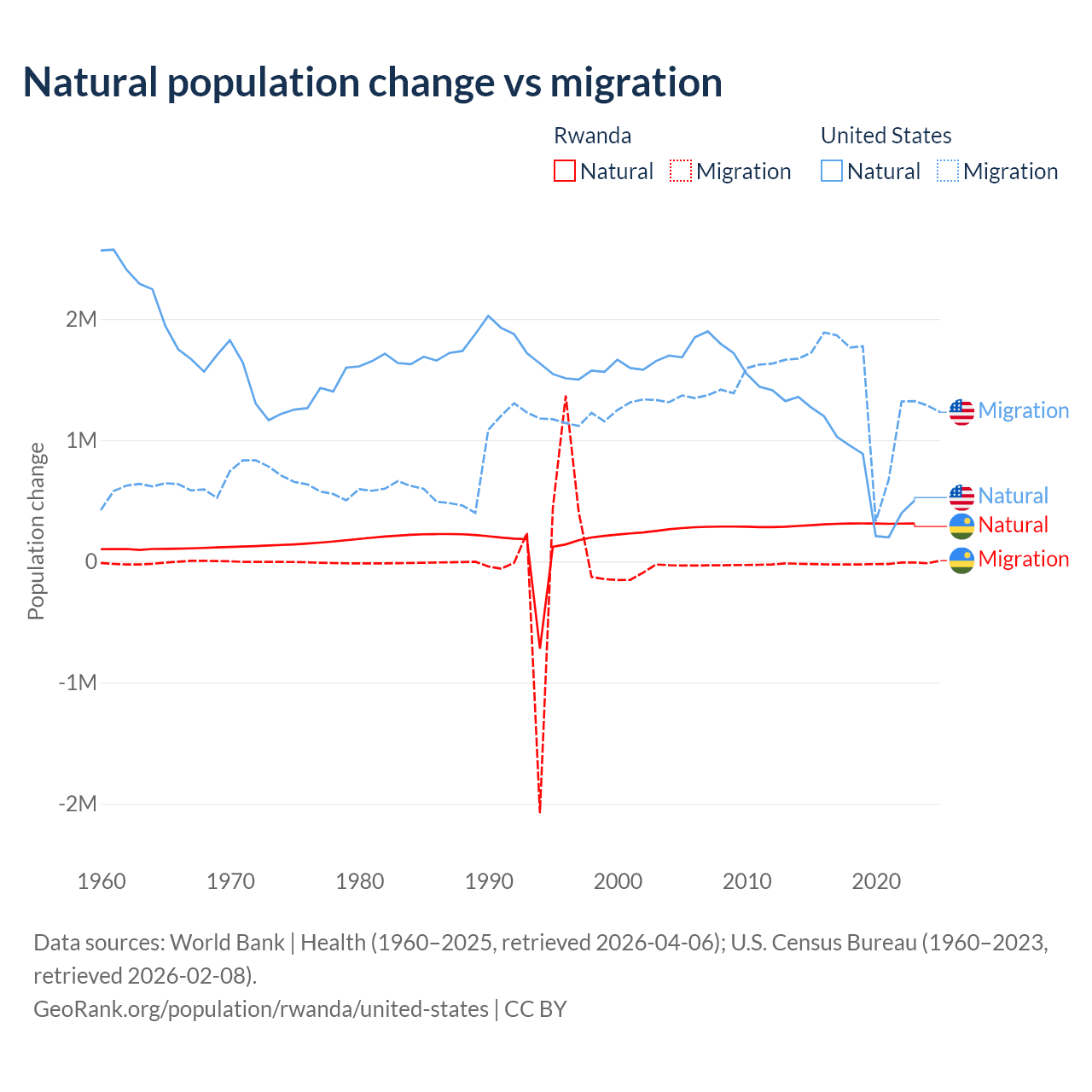 Over the last 10 years, 93.8% of the population change in Rwanda is from natural causes (a gain of 3,081,296 people) and 6.18% is from migration (a loss of 203,035 people). In the United States 35.8% is from natural causes (a gain of 8,005,866 people) and 64.2% is from migration (a gain of 14,334,286 people).