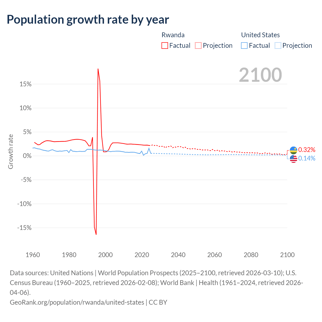 - For the last 10 years, Rwanda has had an average growth rate of +2.31% per year vs +0.65% in the United States.