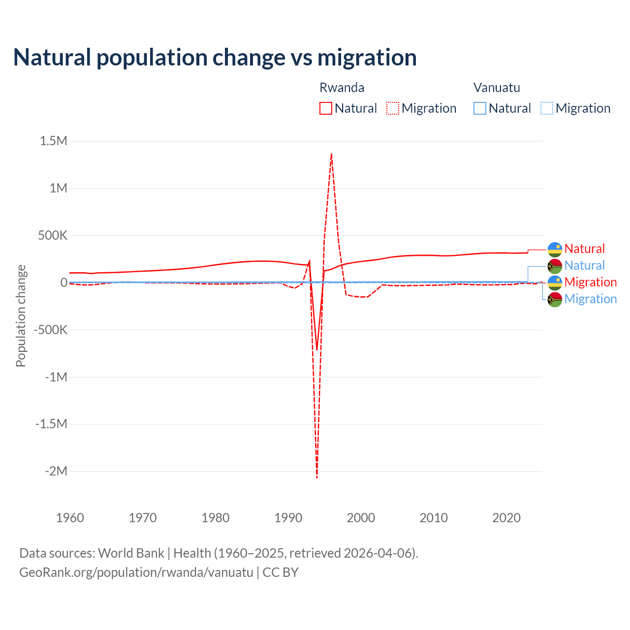 Over the last 10 years, 93.8% of the population change in Rwanda is from natural causes (a gain of 3,081,296 people) and 6.18% is from migration (a loss of 203,035 people). In Vanuatu 92.2% is from natural causes (a gain of 72,941 people) and 7.81% is from migration (a loss of 6,181 people).