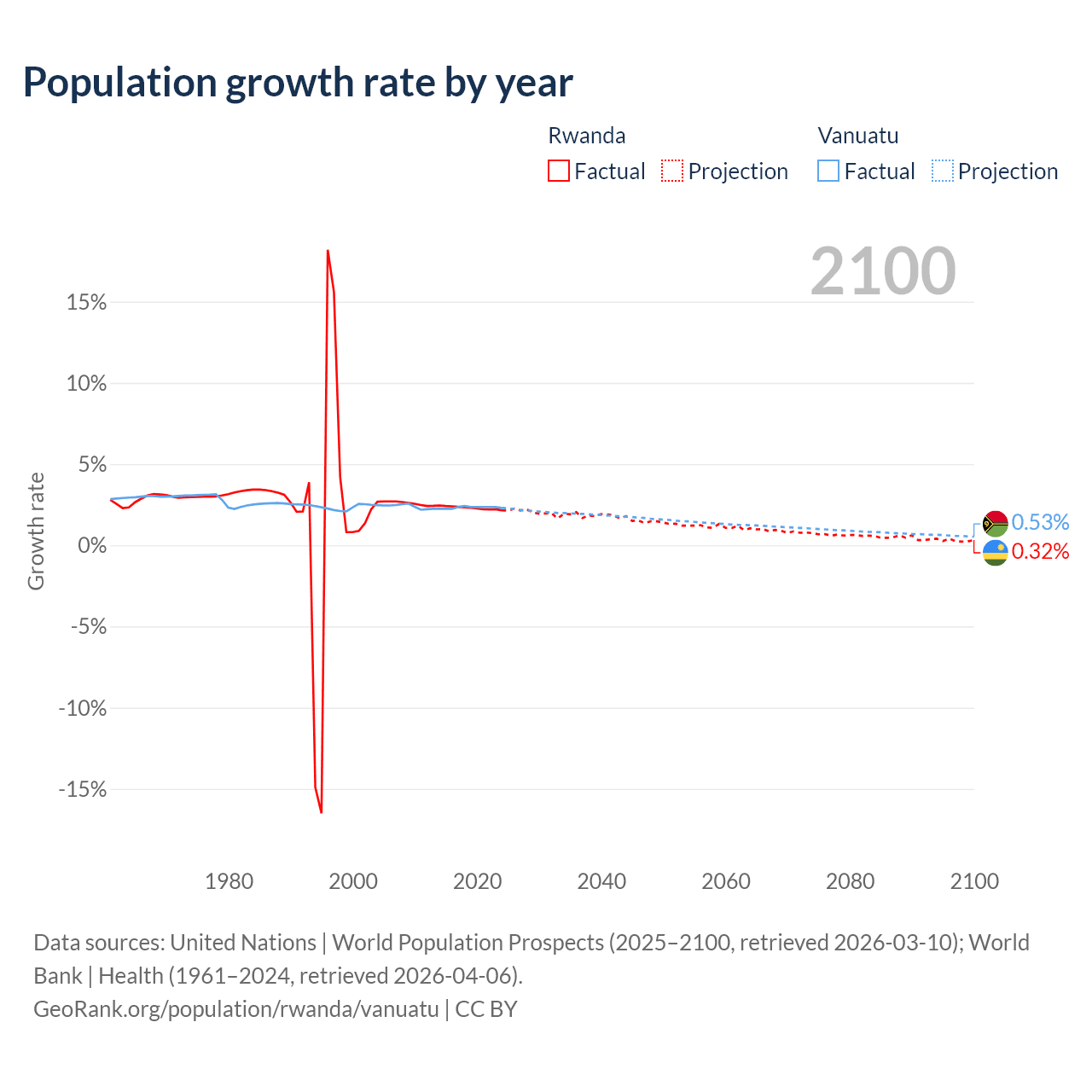 - For the last 10 years, Rwanda has had an average growth rate of +2.31% per year vs +2.33% in Vanuatu.