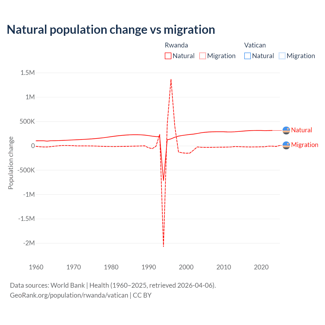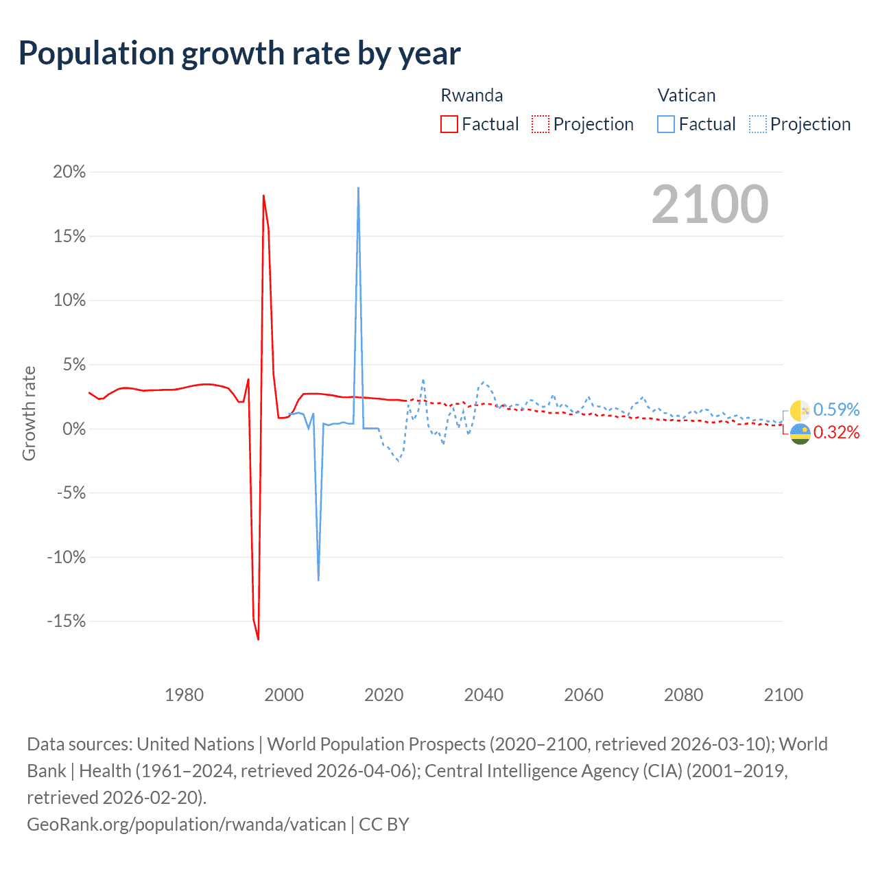 - For the last 10 years, Rwanda has had an average growth rate of +2.31% per year vs +1.9% in the Vatican.