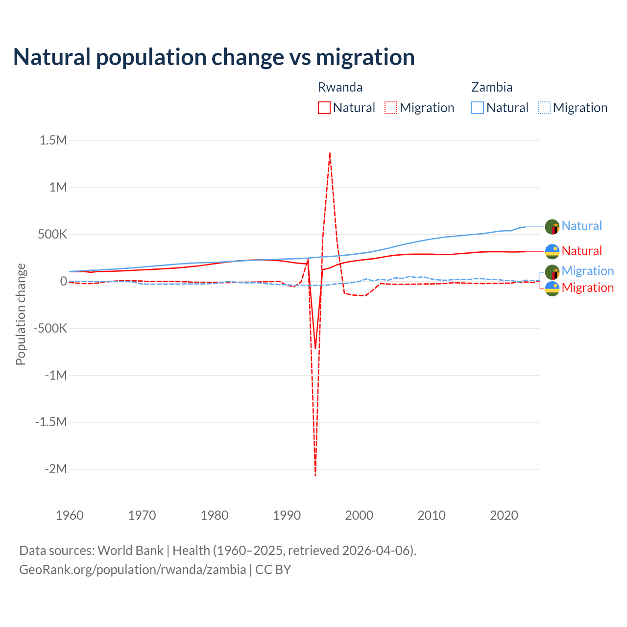 Over the last 10 years, 93.8% of the population change in Rwanda is from natural causes (a gain of 3,081,296 people) and 6.18% is from migration (a loss of 203,035 people). In Zambia 97.4% is from natural causes (a gain of 5,233,797 people) and 2.58% is from migration (a gain of 138,554 people).